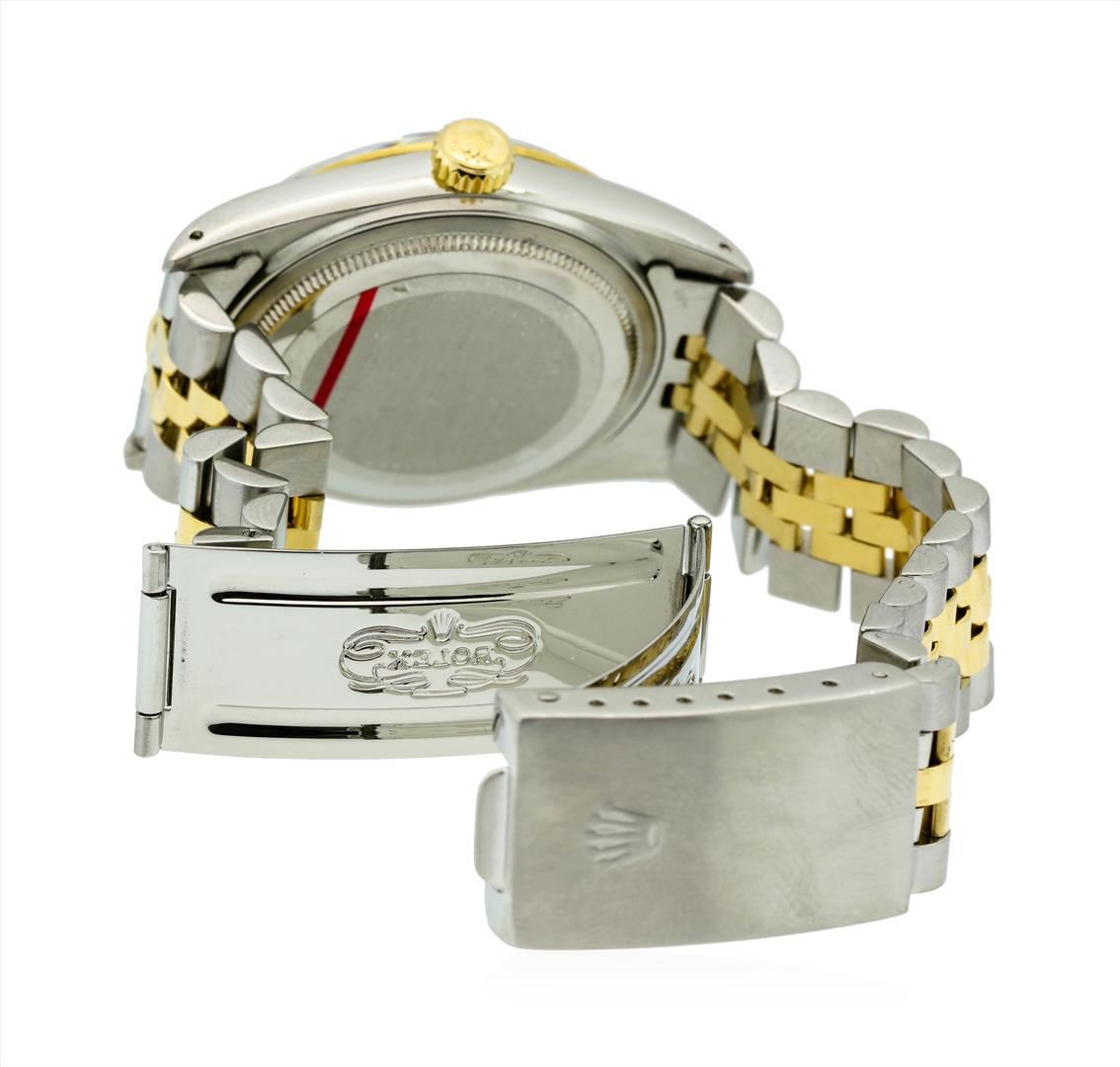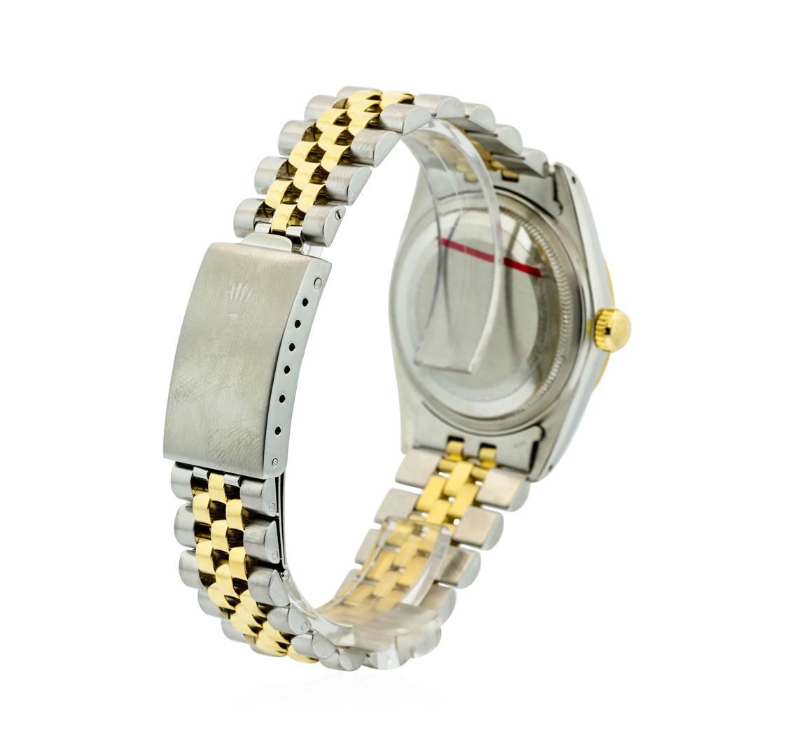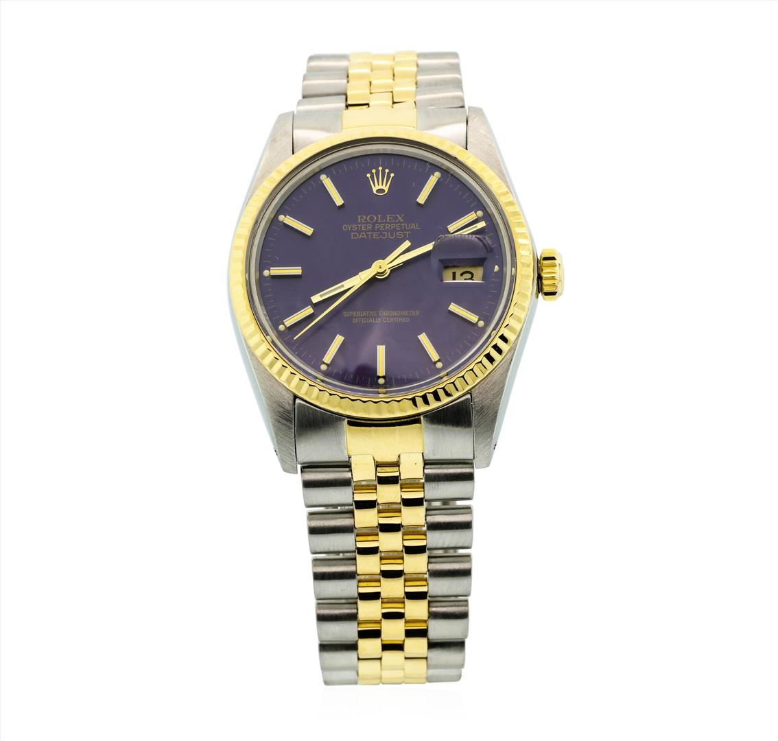 One Men's Two Tone Rolex Datejust Polished, Serviced & Electronically Tested, 14K Yellow Gold & Stainless Steel Case: 36mm, 18K Yellow Gold Crown, Bezel: 18K Yellow Gold Fluted Bezel, Crystal: Acrylic Crystal with Cyclops Lens. Movement: Automatic Winding Movement Caliber 3035. Dial: Blue with Gold Hour Markers, Date Window: 3 O'Clock Position Date Display, Quickset, Model: 16013 Condition: G-6 Extra Fine. Bracelet: Two Tone 18K Yellow Gold & Stainless Steel Jubilee. Bright Polish with Adjustable Standard Clasp, With Rolex Logo.