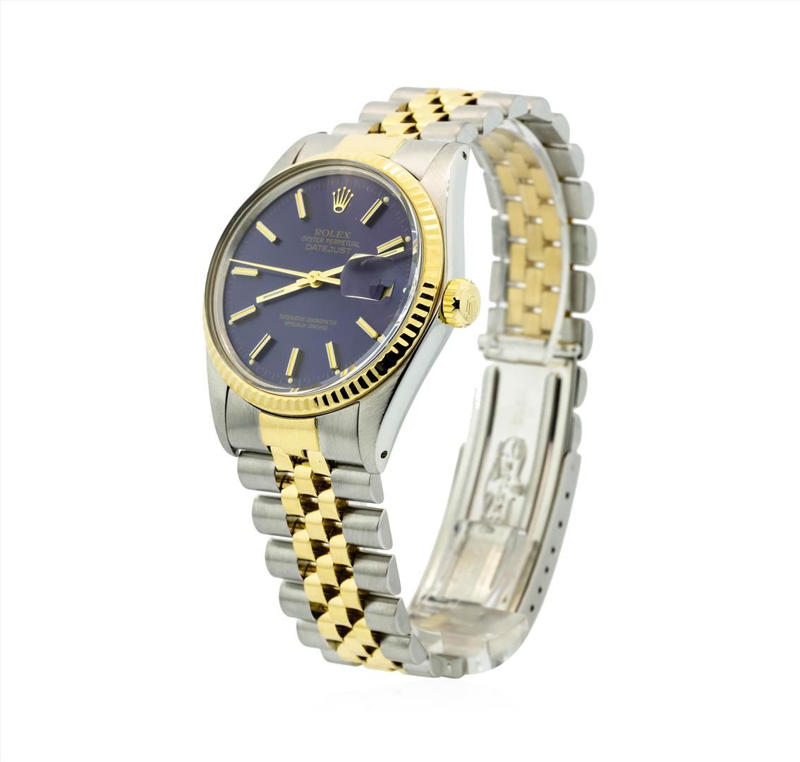 One Men's Two Tone Rolex Datejust Polished, Serviced & Electronically Tested, 14K Yellow Gold & Stainless Steel Case: 36mm, 18K Yellow Gold Crown, Bezel: 18K Yellow Gold Fluted Bezel, Crystal: Acrylic Crystal with Cyclops Lens. Movement: Automatic Winding Movement Caliber 3035. Dial: Blue with Gold Hour Markers, Date Window: 3 O'Clock Position Date Display, Quickset, Model: 16013 Condition: G-6 Extra Fine. Bracelet: Two Tone 18K Yellow Gold & Stainless Steel Jubilee. Bright Polish with Adjustable Standard Clasp, With Rolex Logo.