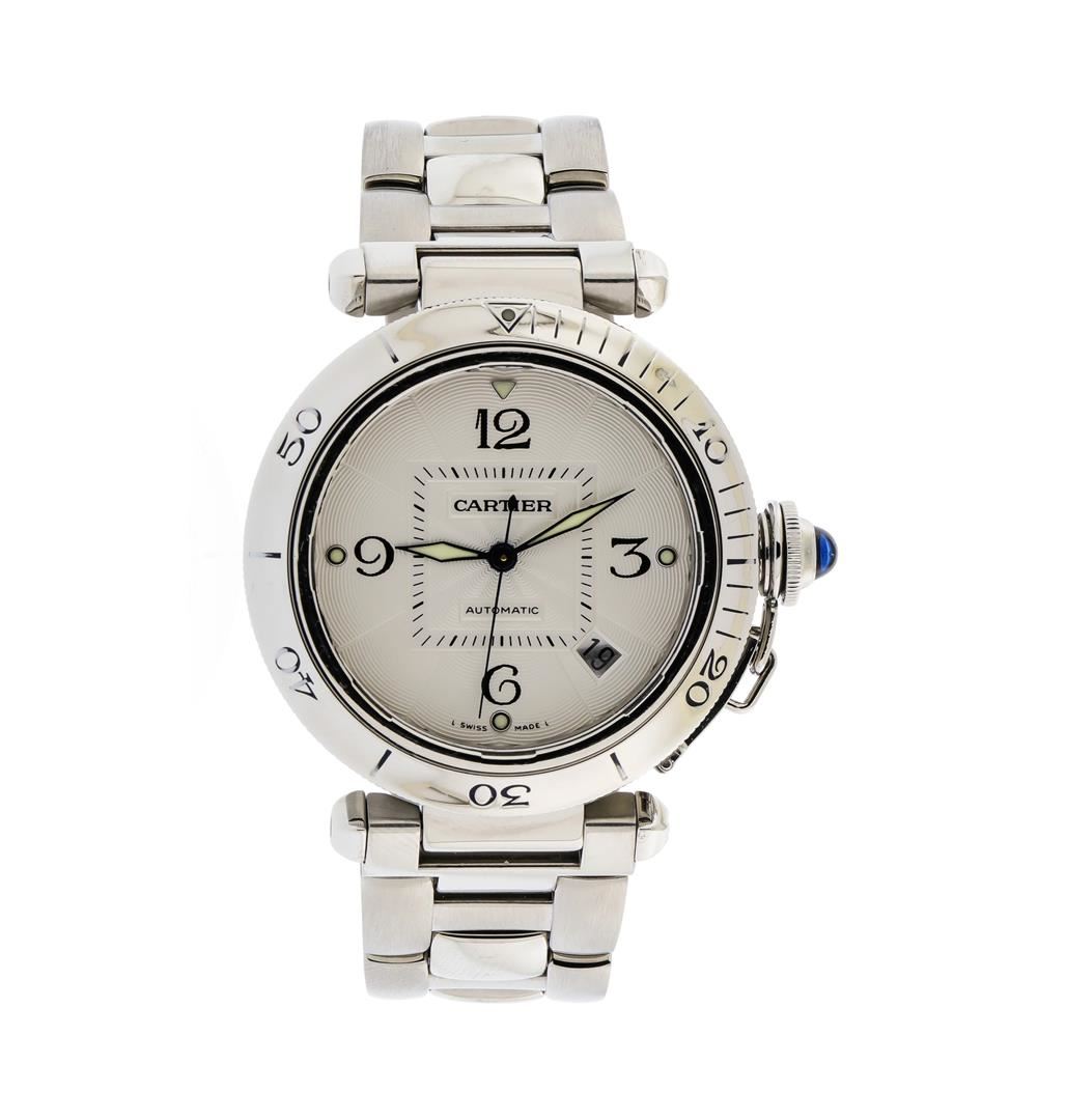One Mens Stainless Steel Cartier Pasha Automatic Wristwatch. Case: 38mm, Stainless Steel with Blue Cabachon Sapphire Crown, Bezel: Stainless Steel Directional Bezel. Crystal: Sapphire Scratch Resistant. Dial: Silver Guiloche with Arabic Hour Marker, Hands: Steel Blue Luminous Hands. Condition: Good Condition. Bracelet: Stainless Steel with Cartier Pasha Double Deployment clasp. Fits a wrist up to 6.15 inches in length.