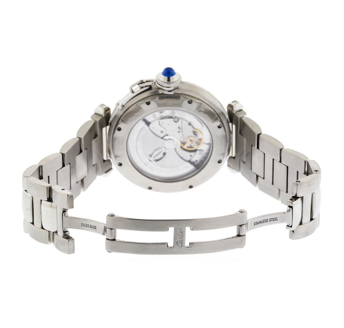 One Mens Stainless Steel Cartier Pasha Automatic Wristwatch. Case: 38mm, Stainless Steel with Blue Cabachon Sapphire Crown, Bezel: Stainless Steel Directional Bezel. Crystal: Sapphire Scratch Resistant. Dial: Silver Guiloche with Arabic Hour Marker, Hands: Steel Blue Luminous Hands. Condition: Good Condition. Bracelet: Stainless Steel with Cartier Pasha Double Deployment clasp. Fits a wrist up to 6.15 inches in length.