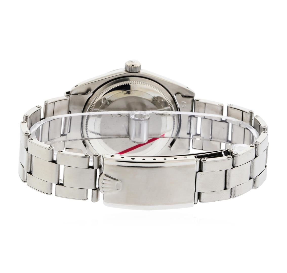 One Mens Stainless Steel Rolex Date Wristwatch. Case: 34mm, Stainless Steel Crown, Bezel: Domed Stainless Steel Bezel. Crystal: Acrylic Crystal Cyclops Lens. Movement: Automatic Winding Movement. Dial: Silver with Age and Patina and Silver Markers. Date Window: 3 O'Clock Position Date Display, Non-Quickset, Model: 1500. Condition: Great Condition. Bracelet: Stainless Steel Oyster Bracelet, Adjustable fits up to a 7.10 inch wrist. Standard Clasp, With Rolex Logo.