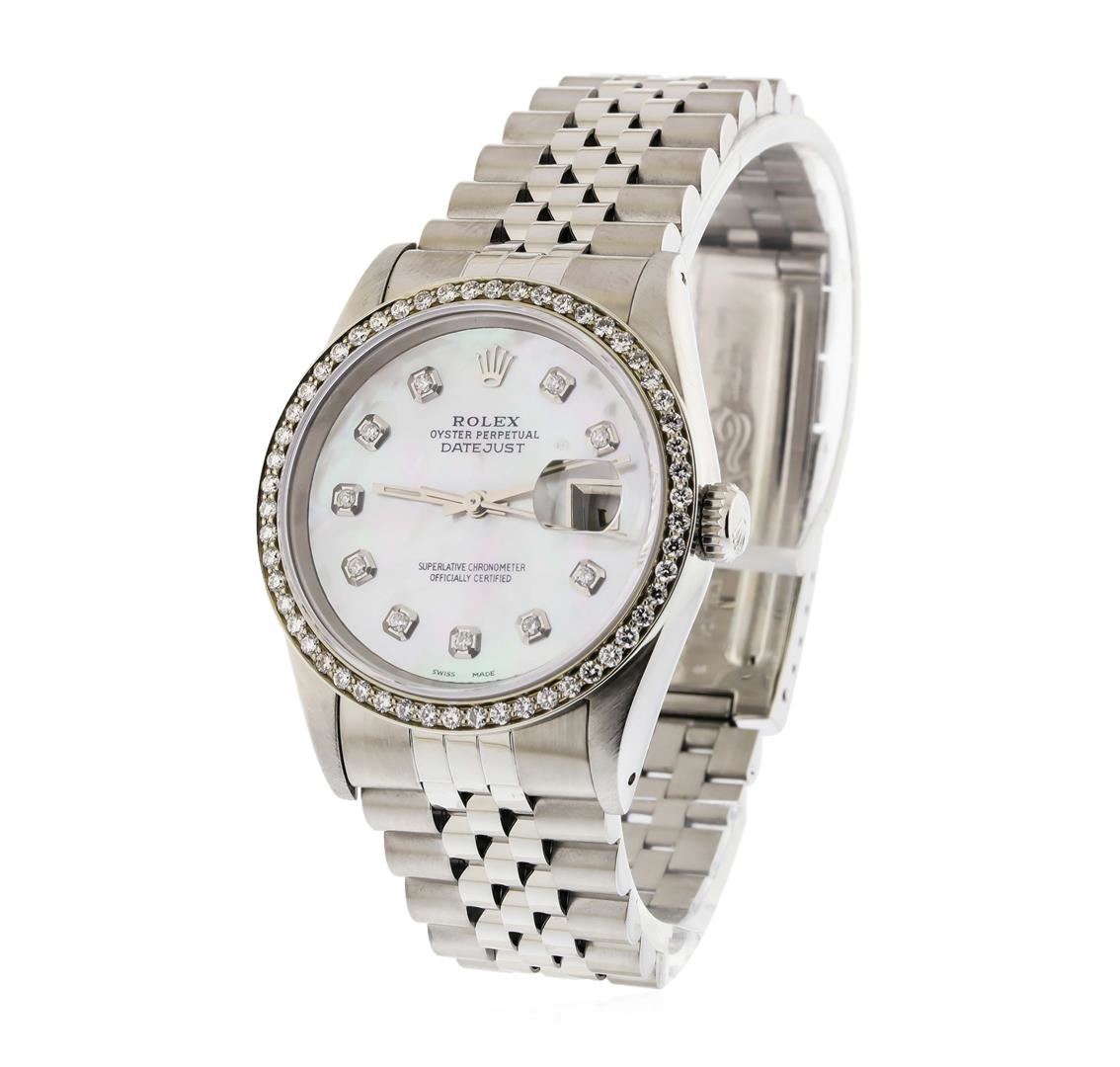 One Mens Stainless Steel Rolex Date Wristwatch. Case: 36mm, Stainless Steel Crown, Bezel: Beaded Diamond Bezel with approximately 1.10ctw with a Clarity of VS1-VS2 and a color of G to H. Crystal: Sapphire Crystal with Cyclops Lens. Movement: Automatic Winding Movement. Custom Dial: Mother of Pearl Dial with Diamond Markers, Diamond Count: 10 Diamonds in Dial G To H In Color, VS1 to SI1 Clarity. Date Window: 3 O'Clock Position Date Display, Quickset, Model: 16220. Condition: G-5 Fine. Bracelet: Stainless Steel Jubilee, Bright Polish, Adjustable. Standard Clasp, With Rolex Logo.