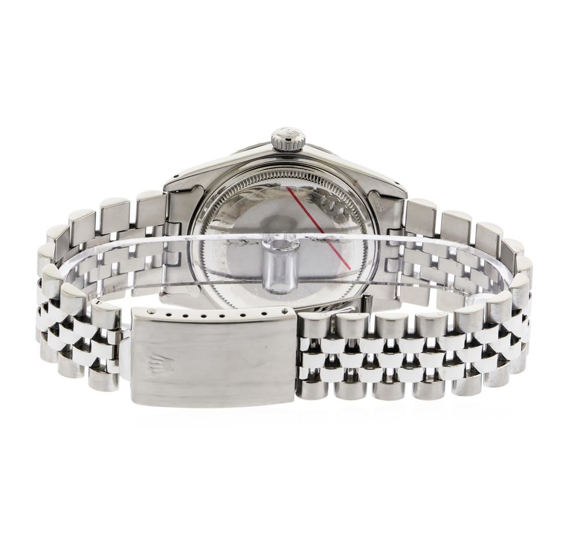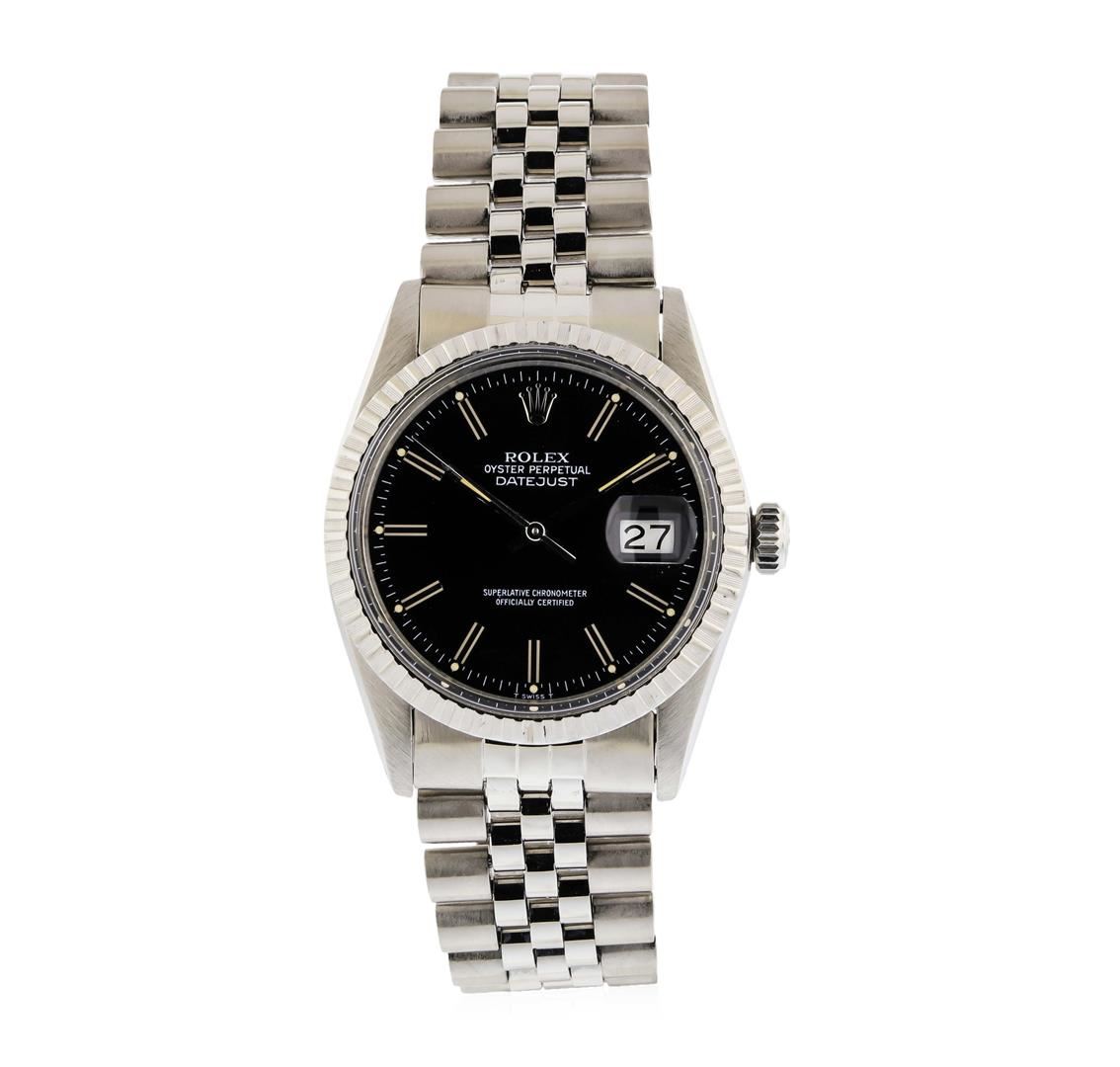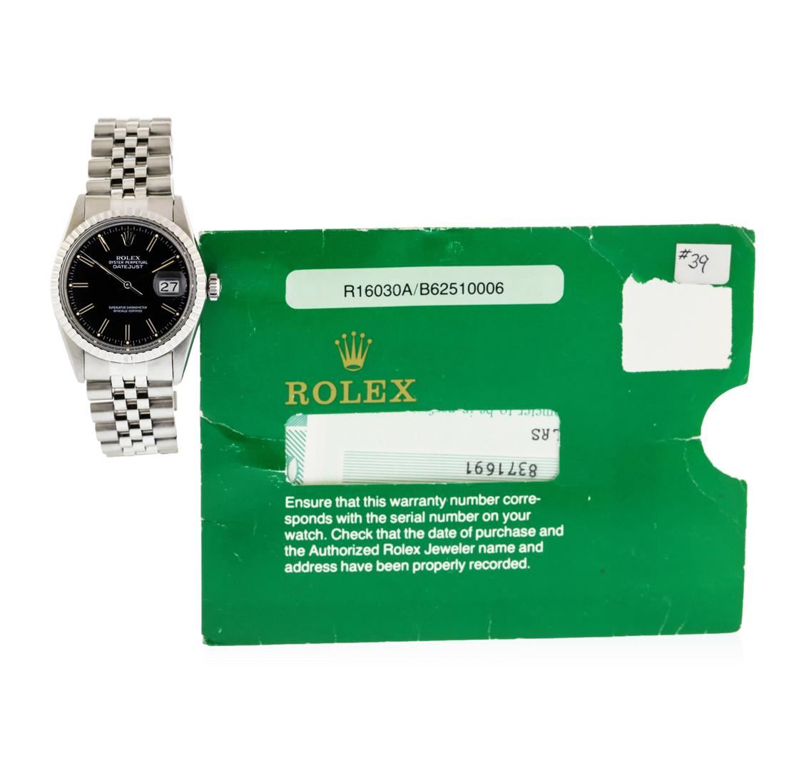 One Mens Stainless Steel Rolex Date Wristwatch. Case: 36mm, Stainless Steel Crown, Bezel: Fluted Stainless Steel Bezel. Crystal: Synthetic Sapphire with Cyclops Lens. Movement: Automatic Winding Movement. Dial: Black with Stainless Steel Markers. Date Window: 3 O'Clock Position Date Display, Quickset, Model: 16030. Condition: G-6 Extra Fine. Bracelet: Stainless Steel Jubilee, Bright Polish, Adjustable. Standard Clasp, With Rolex Logo. This watch comes with original papers.