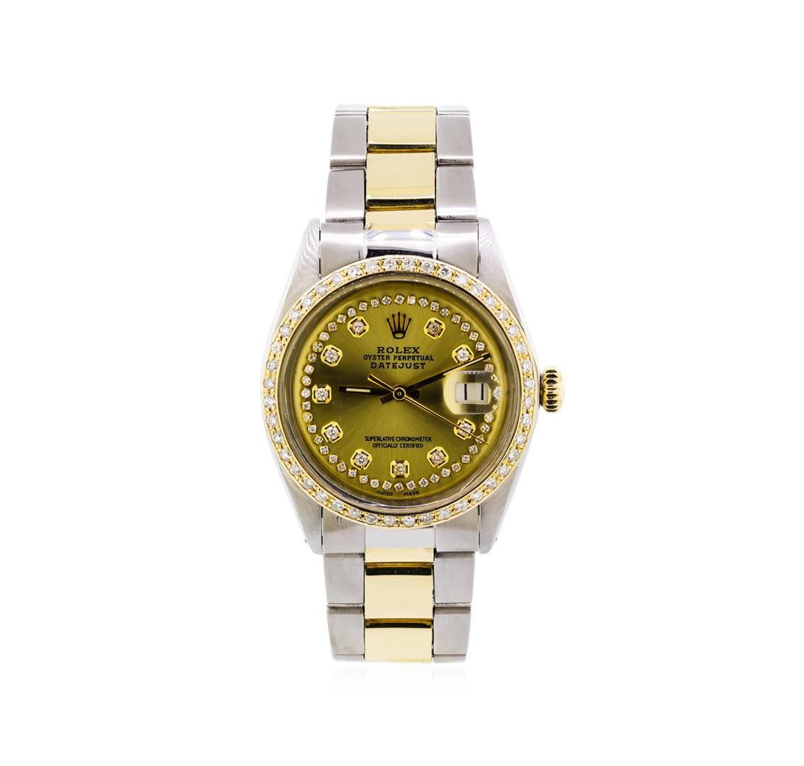 One gents, hand crafted & machine milled Rolex two-tone DateJust wristwatch electronically tested, Stainless Steel Case: 36mm oyster, 14KT yellow gold Crown: twinlock with logo, non-factory Custom Bezel: diamond set, Crystal: acrylic cyclops lens, Circa: 1971.Movement: superlative chronometer, Rolex signed Customized Dial: Champagne color, with baton hands, diamond markers, and a diamond ribbon minute track, Date Window: 3 o'clock position, non-quick set, Bracelet: two-tone 14KT yellow gold & stainless steel oyster, bright polish & brushed finish, Condition: G-5 Fine. Seven and one half inch length, adjustable. Standard clasp, with logo. Containing: Fifty Four prong set round brilliant cut diamonds, measuring an average of 1.70mm in diameter, approximate total weight of 54 Stones = 1.00ct. Graded in the setting. Clarity: VS-2 to SI-2. Color: F - H. Forty Eight prong set round brilliant cut diamonds, measuring an average of 1.00mm in diameter, approximate total weight of 48 Stones = 0.19ct. Graded in the setting. Clarity: VS-2 to SI-1. Color: G - H. Total Weight of Diamonds 1.19ct. Total Weight of Watch 86.49gm. AIG Appraised.