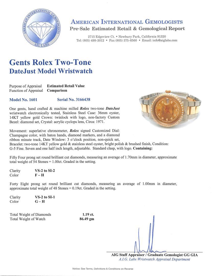 One gents, hand crafted & machine milled Rolex two-tone DateJust wristwatch electronically tested, Stainless Steel Case: 36mm oyster, 14KT yellow gold Crown: twinlock with logo, non-factory Custom Bezel: diamond set, Crystal: acrylic cyclops lens, Circa: 1971.Movement: superlative chronometer, Rolex signed Customized Dial: Champagne color, with baton hands, diamond markers, and a diamond ribbon minute track, Date Window: 3 o'clock position, non-quick set, Bracelet: two-tone 14KT yellow gold & stainless steel oyster, bright polish & brushed finish, Condition: G-5 Fine. Seven and one half inch length, adjustable. Standard clasp, with logo. Containing: Fifty Four prong set round brilliant cut diamonds, measuring an average of 1.70mm in diameter, approximate total weight of 54 Stones = 1.00ct. Graded in the setting. Clarity: VS-2 to SI-2. Color: F - H. Forty Eight prong set round brilliant cut diamonds, measuring an average of 1.00mm in diameter, approximate total weight of 48 Stones = 0.19ct. Graded in the setting. Clarity: VS-2 to SI-1. Color: G - H. Total Weight of Diamonds 1.19ct. Total Weight of Watch 86.49gm. AIG Appraised.