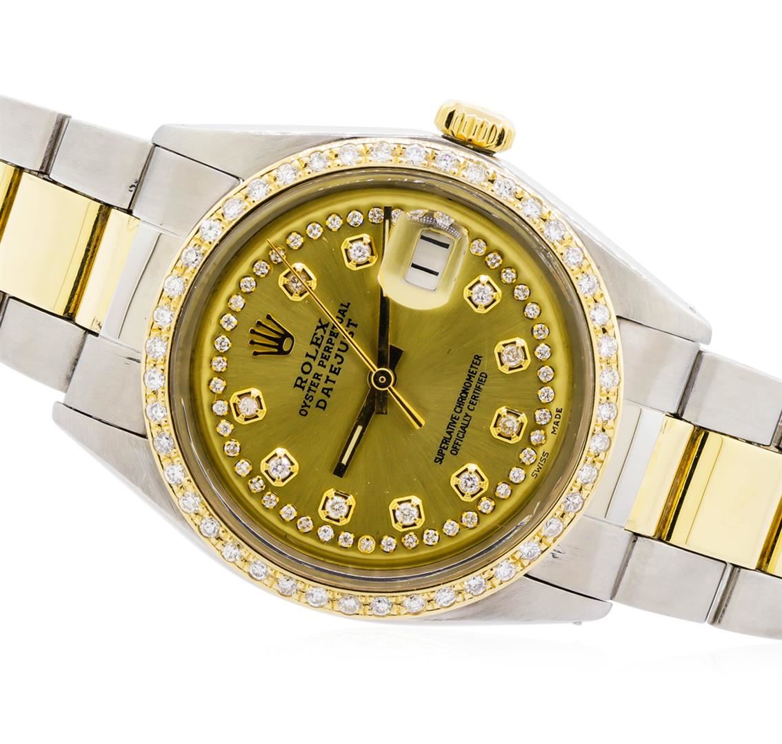One gents, hand crafted & machine milled Rolex two-tone DateJust wristwatch electronically tested, Stainless Steel Case: 36mm oyster, 14KT yellow gold Crown: twinlock with logo, non-factory Custom Bezel: diamond set, Crystal: acrylic cyclops lens, Circa: 1971.Movement: superlative chronometer, Rolex signed Customized Dial: Champagne color, with baton hands, diamond markers, and a diamond ribbon minute track, Date Window: 3 o'clock position, non-quick set, Bracelet: two-tone 14KT yellow gold & stainless steel oyster, bright polish & brushed finish, Condition: G-5 Fine. Seven and one half inch length, adjustable. Standard clasp, with logo. Containing: Fifty Four prong set round brilliant cut diamonds, measuring an average of 1.70mm in diameter, approximate total weight of 54 Stones = 1.00ct. Graded in the setting. Clarity: VS-2 to SI-2. Color: F - H. Forty Eight prong set round brilliant cut diamonds, measuring an average of 1.00mm in diameter, approximate total weight of 48 Stones = 0.19ct. Graded in the setting. Clarity: VS-2 to SI-1. Color: G - H. Total Weight of Diamonds 1.19ct. Total Weight of Watch 86.49gm. AIG Appraised.