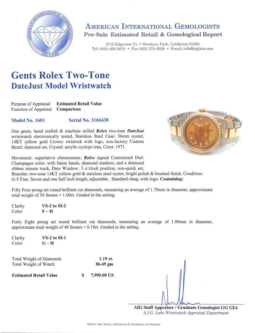 One gents, hand crafted & machine milled Rolex two-tone DateJust wristwatch electronically tested, Stainless Steel Case: 36mm oyster, 14KT yellow gold Crown: twinlock with logo, non-factory Custom Bezel: diamond set, Crystal: acrylic cyclops lens, Circa: 1971.Movement: superlative chronometer, Rolex signed Customized Dial: Champagne color, with baton hands, diamond markers, and a diamond ribbon minute track, Date Window: 3 o'clock position, non-quick set, Bracelet: two-tone 14KT yellow gold & stainless steel oyster, bright polish & brushed finish, Condition: G-5 Fine. Seven and one half inch length, adjustable. Standard clasp, with logo. Containing: Fifty Four prong set round brilliant cut diamonds, measuring an average of 1.70mm in diameter, approximate total weight of 54 Stones = 1.00ct. Graded in the setting. Clarity: VS-2 to SI-2. Color: F - H. Forty Eight prong set round brilliant cut diamonds, measuring an average of 1.00mm in diameter, approximate total weight of 48 Stones = 0.19ct. Graded in the setting. Clarity: VS-2 to SI-1. Color: G - H. Total Weight of Diamonds 1.19ct. Total Weight of Watch 86.49gm. AIG Appraised at $7,990.00.