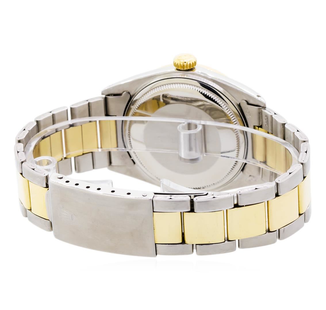 One gents, hand crafted & machine milled Rolex two-tone DateJust wristwatch electronically tested, Stainless Steel Case: 36mm oyster, 14KT yellow gold Crown: twinlock with logo, non-factory Custom Bezel: diamond set, Crystal: acrylic cyclops lens, Circa: 1971.Movement: superlative chronometer, Rolex signed Customized Dial: Champagne color, with baton hands, diamond markers, and a diamond ribbon minute track, Date Window: 3 o'clock position, non-quick set, Bracelet: two-tone 14KT yellow gold & stainless steel oyster, bright polish & brushed finish, Condition: G-5 Fine. Seven and one half inch length, adjustable. Standard clasp, with logo. Containing: Fifty Four prong set round brilliant cut diamonds, measuring an average of 1.70mm in diameter, approximate total weight of 54 Stones = 1.00ct. Graded in the setting. Clarity: VS-2 to SI-2. Color: F - H. Forty Eight prong set round brilliant cut diamonds, measuring an average of 1.00mm in diameter, approximate total weight of 48 Stones = 0.19ct. Graded in the setting. Clarity: VS-2 to SI-1. Color: G - H. Total Weight of Diamonds 1.19ct. Total Weight of Watch 86.49gm. AIG Appraised.