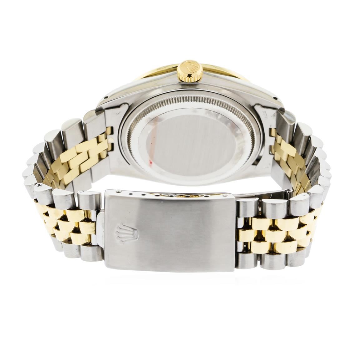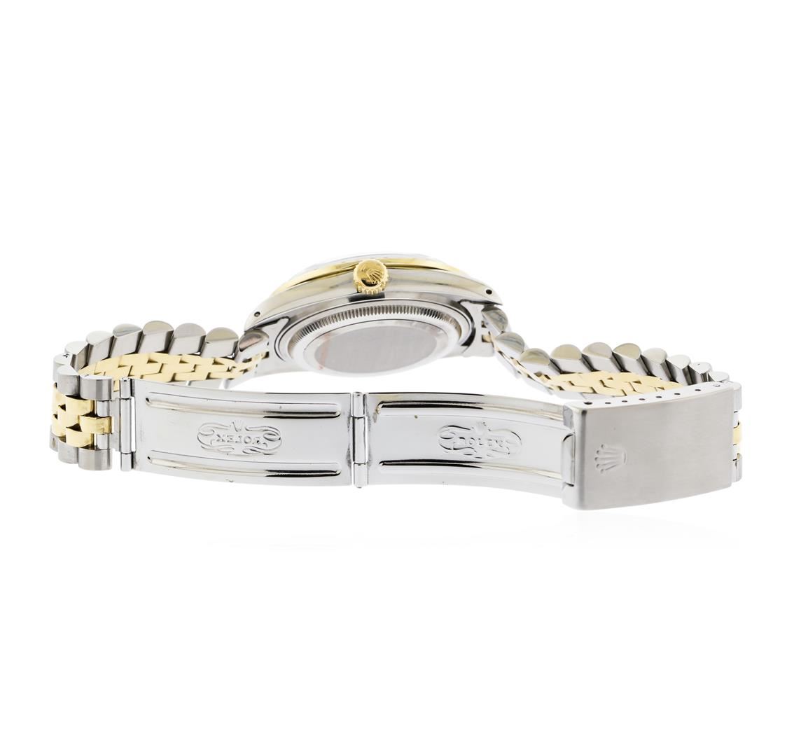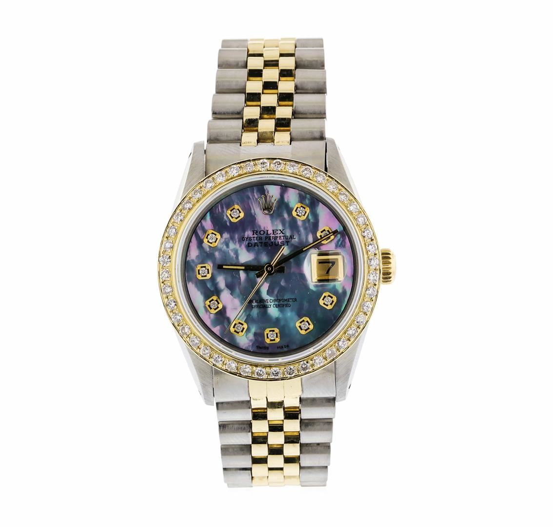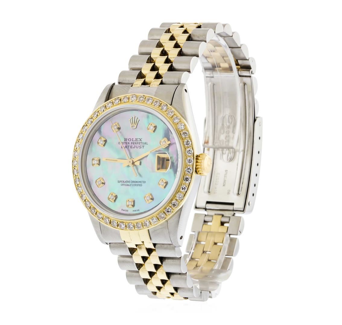 One Mens Two Tone Rolex Datejust Polished, Serviced & Electronically Tested, 18K Yellow Gold & Stainless Steel. Case: 36mm, 14K Yellow Gold Crown, Custom Bezel: 18K Yellow Gold Beadset Diamond Bezel, Diamond Count: 45 Diamonds with an approximate Total Weight of 1.00 Carat, Clarity: SI-VS, Color: G to H. Custom Crystal: Synthetic Sapphire Cyclops Lens. Movement: Automatic Winding Movement. Custom Dial: Mother of Pearl Dial with Diamond Markers, Diamond Count: 10 Diamonds in Dial G To H In Color, VS1 to SI1 Clarity. Date Window: 3 O'Clock Position Date Display, Quickset, Model: 16013 Condition: G-6 Extra Fine. Bracelet: Two Tone 14K Yellow Gold & Stainless Steel Jubilee. Bright Polish, Adjustable Bracelet with Standard Clasp and Rolex Logo.