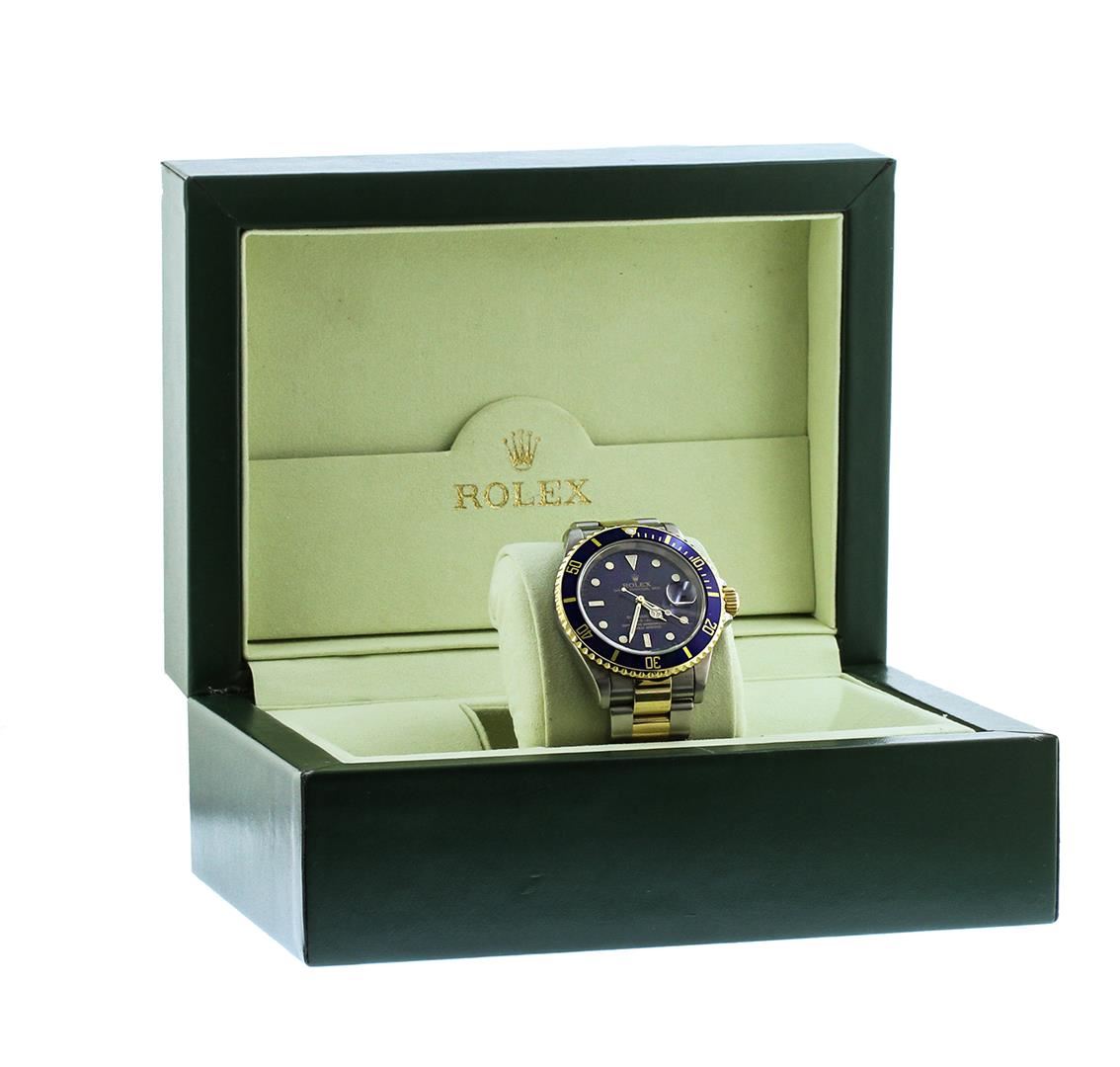 Mens Two-tone stainless steel and 18k yellow gold gents Rolex Submariner wristwatch. Blue dial with gold tone hands and cyclops date window at 3 o`clock position, Automatic Rolex movement, Sapphire Crystal, Quickset Movement, complete with box. In good used condition.