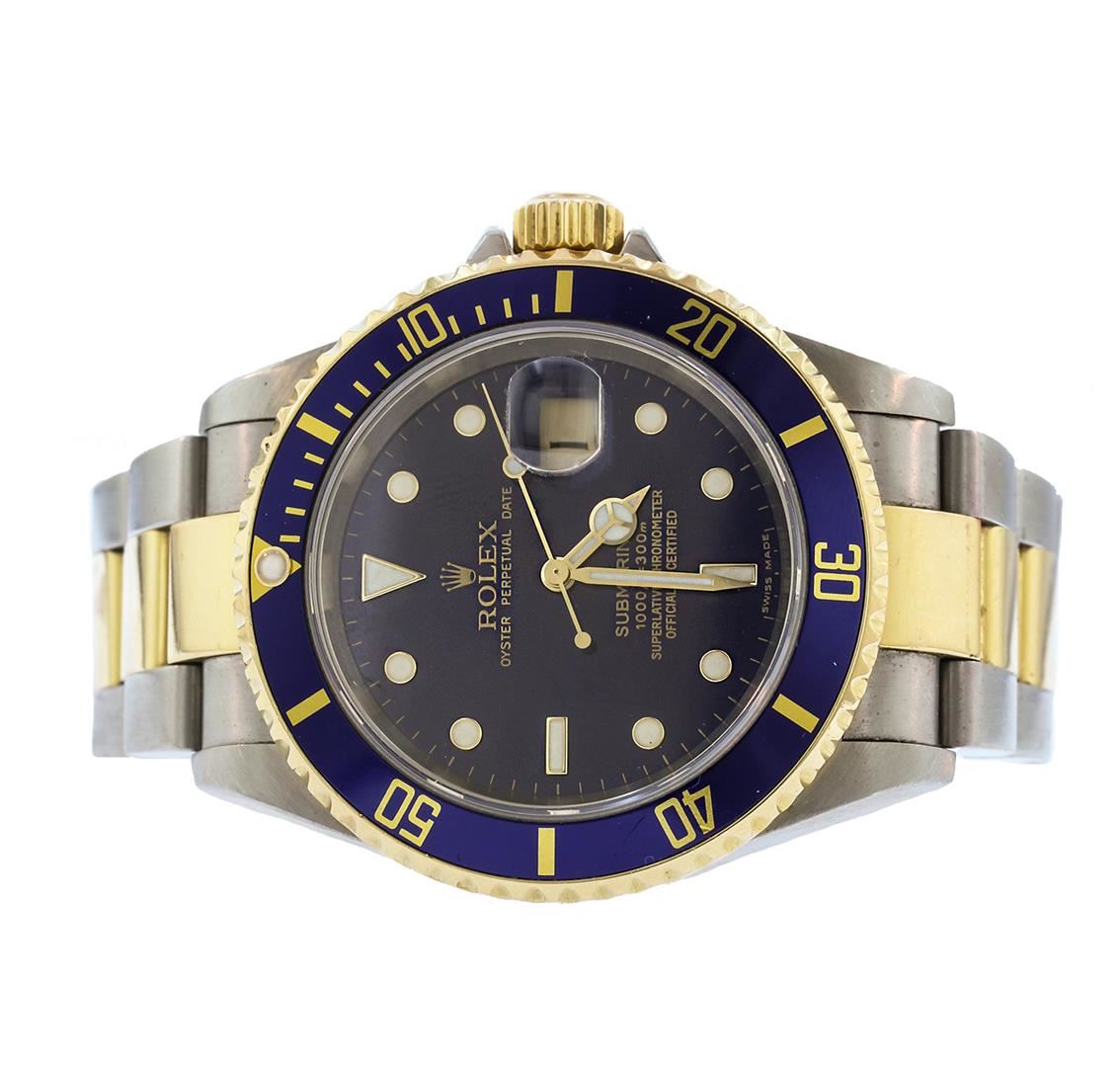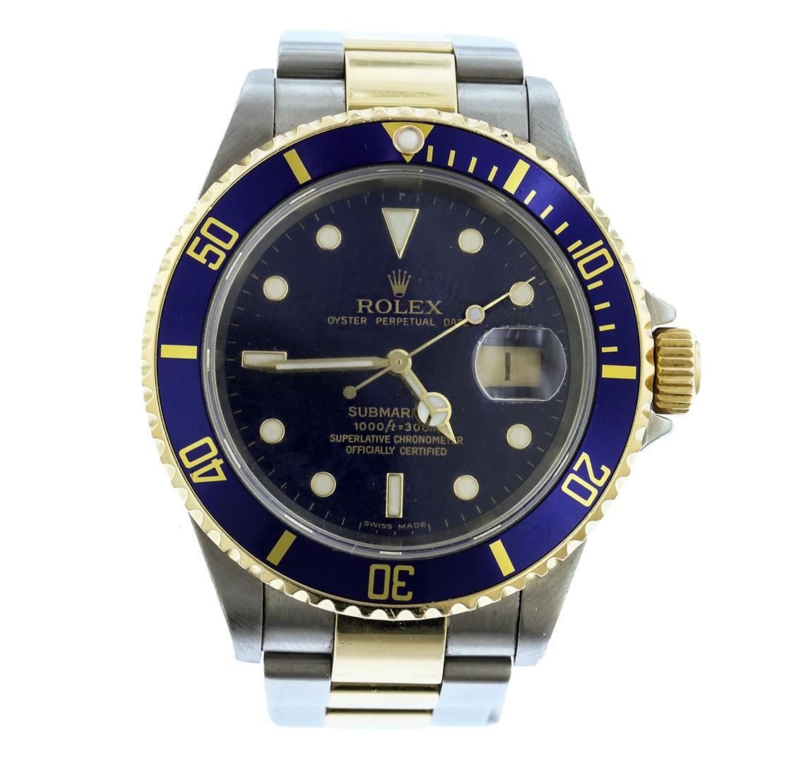 Mens Two-tone stainless steel and 18k yellow gold gents Rolex Submariner wristwatch. Blue dial with gold tone hands and cyclops date window at 3 o`clock position, Automatic Rolex movement, Sapphire Crystal, Quickset Movement, complete with box. In good used condition.