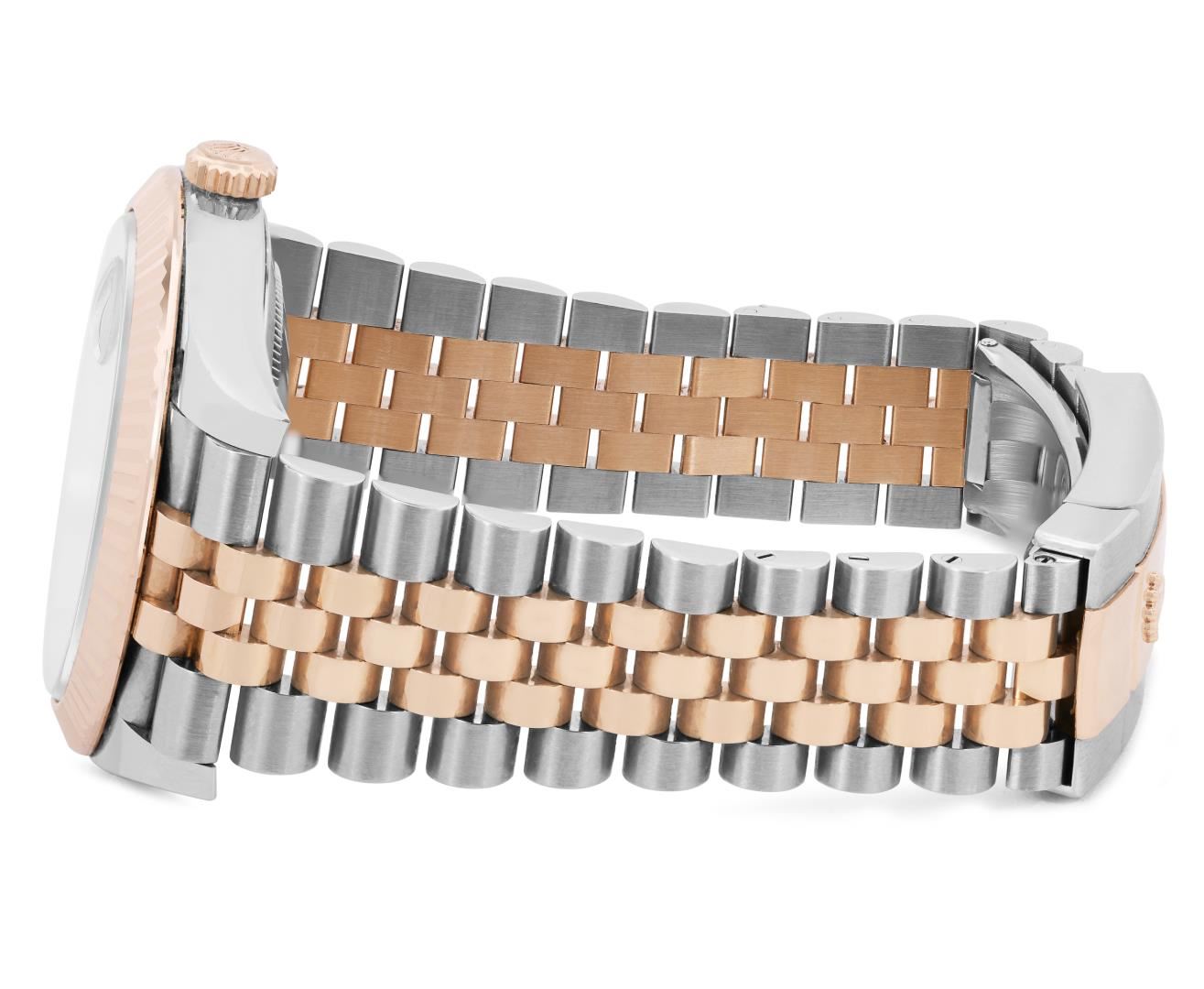 One Mens Pre Owned 18K Rose Gold And Stainless Steel Rolex Datejust 41MM Polished, Serviced and Electronically Tested, Rolex Rose Gold and Stainless Steel Case: 41mm, Rolex Rose Gold Crown, Rolex Bezel: 18K Rose Gold Fluted Bezel. Crystal: Sapphire With Magnified Date Window. Rolex Hands: Lumi Hands. Rolex Movement: Automatic Winding Movement 3235. Rolex Dial: Factory Wimbledon Dial with Roman Hour Markers. Date Window: 3 O'Clock Position Date Display, Quickset, Model: Datejust 41MM. Condition: G-6 Extra Fine. Rolex Bracelet: Two Tone 18K Rose Gold And Stainless Steel Jubilee Band. Bright Polish. 7.0 Inch Length, Adjustable. Standard Clasp, With Rolex Logo. This Watch Has Been Serviced And Polished It Is Free Of All Scratches And Dents. This Watch Comes With A Rolex Box and Card.