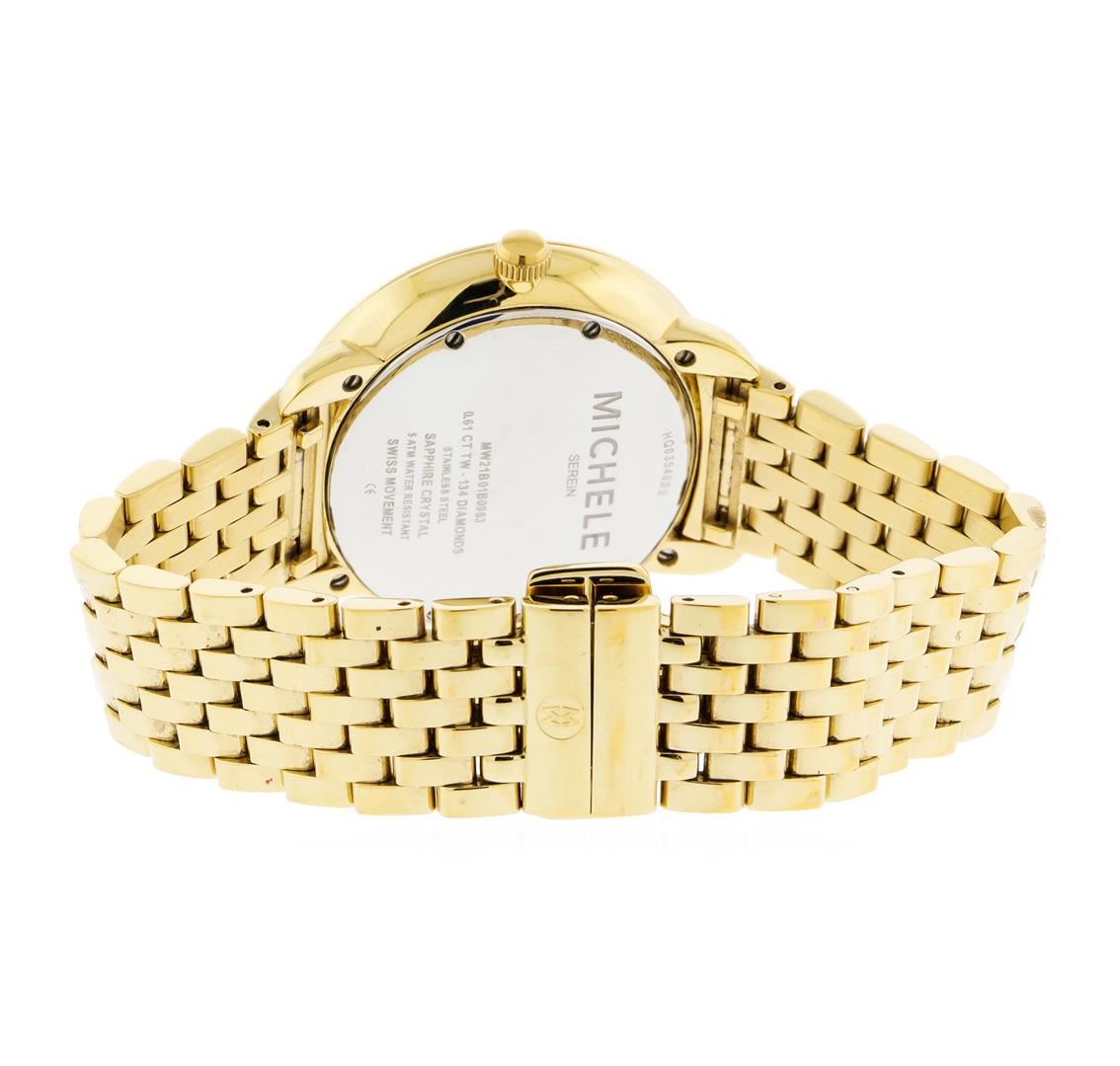 One Michele Sereign 12 Diamond Gold Plated Wristwatch. The watch is in good used condition and has the following features: Movement: Swiss Quartz, Case Size: 28mm, Case Material: Gold Plated Stainless Steel, Bracelet Material: Gold Plated Stainless Steel, Gender: Ladies, Crystal Material: Sapphire, Approximate Total Diamond Weight: 0.36ctw. This watch does not come with a box or papers however we do guarantee it to be authentic.