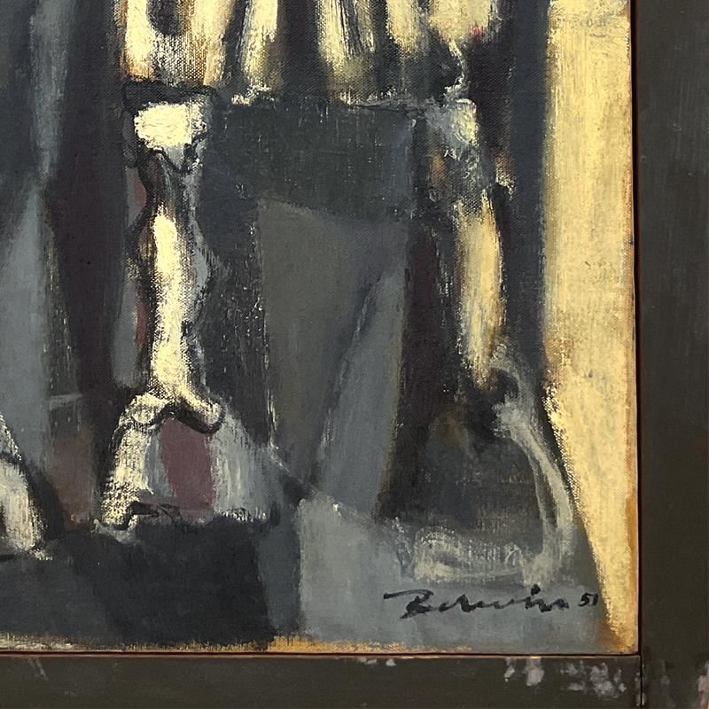 "Kings Guard" is an original painting on stretched canvas by Milton Berwin (1925-2023), dated 1951 and hand signed by the artist. This piece was framed with simple wood planks by the artist. Includes Letter of Authenticity. Measures approx. 42" x 27" (frame), 40" x 25" (image).