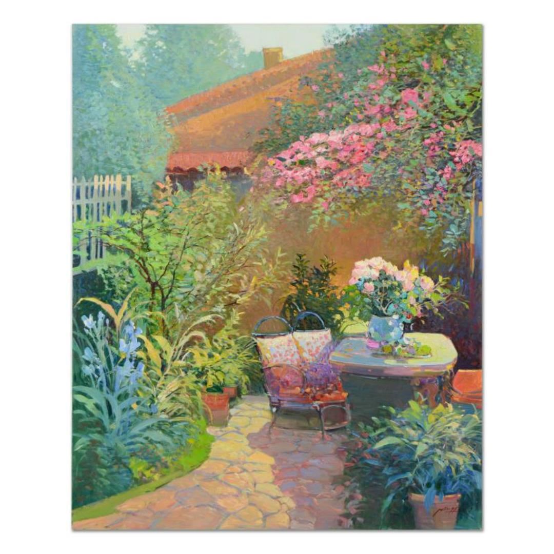 "Backyard Retreat" is an original oil painting on stretched canvas by Ming Feng, hand signed by the artist. Includes Letter of Authenticity. Measures approx. 24" x 30" (image).