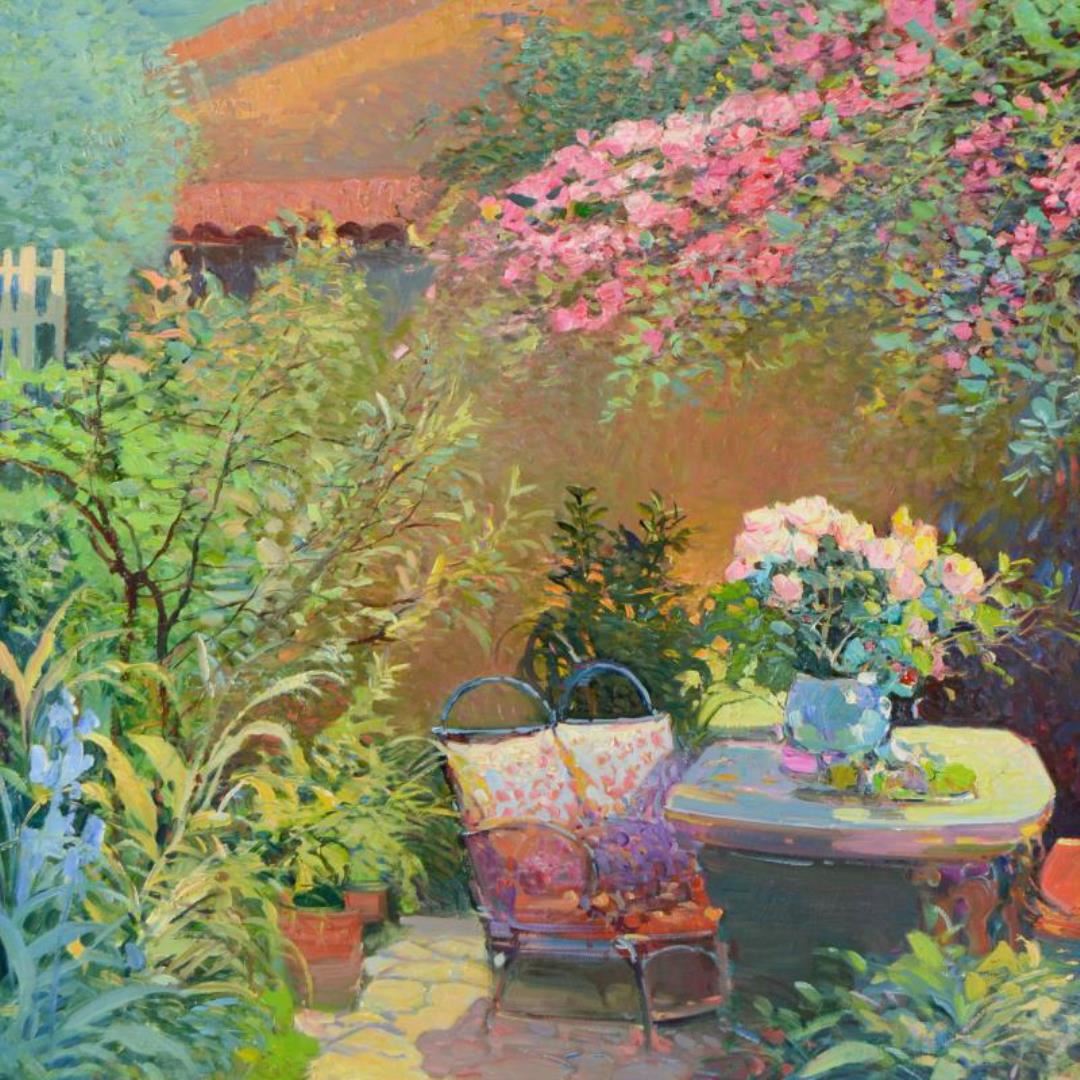 "Backyard Retreat" is an original oil painting on stretched canvas by Ming Feng, hand signed by the artist. Includes Letter of Authenticity. Measures approx. 24" x 30" (image).