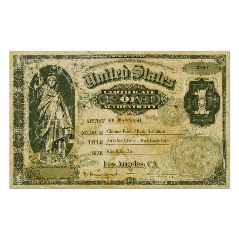 "Art Is Not a Crime (Chrome Blue)" is a limited edition resin sculpture by Mr. Brainwash, numbered and hand signed by the artist. Includes Certificate of Authenticity. Measures approx. 8" x 6.5" x 2".