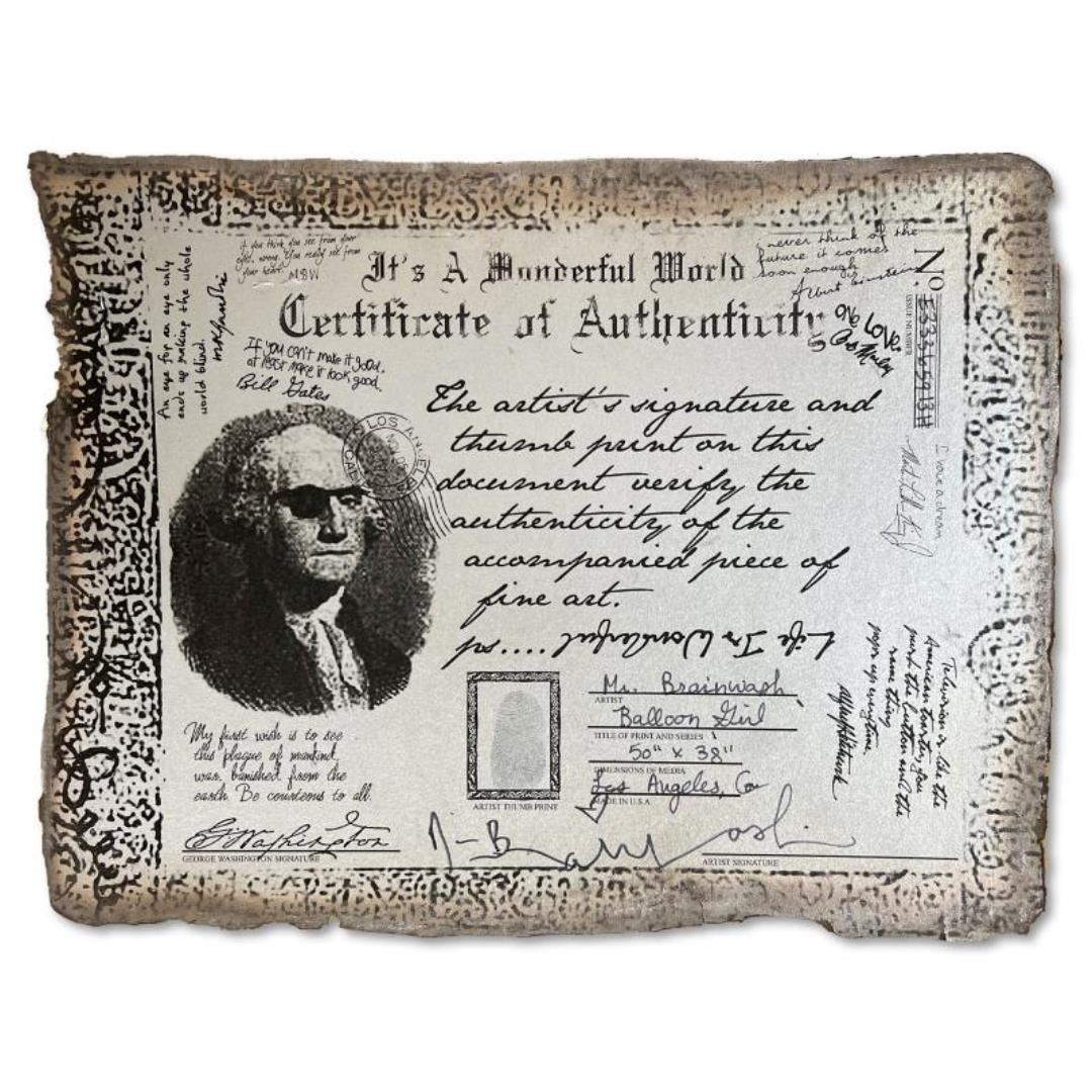 "Balloon Girl" is a mixed media original on deckle edge paper by Mr. Brainwash, hand signed inverso and bearing the thumbprint of the artist. Includes Certificate of Authenticity. Measures approx. 38" x 50" (image).