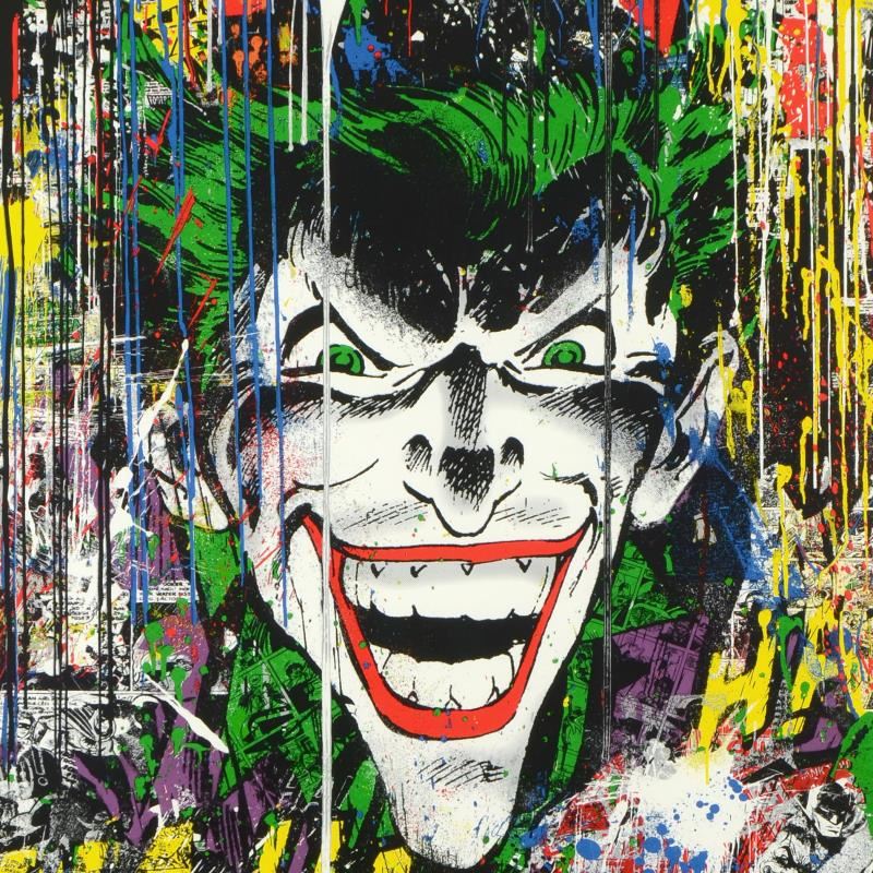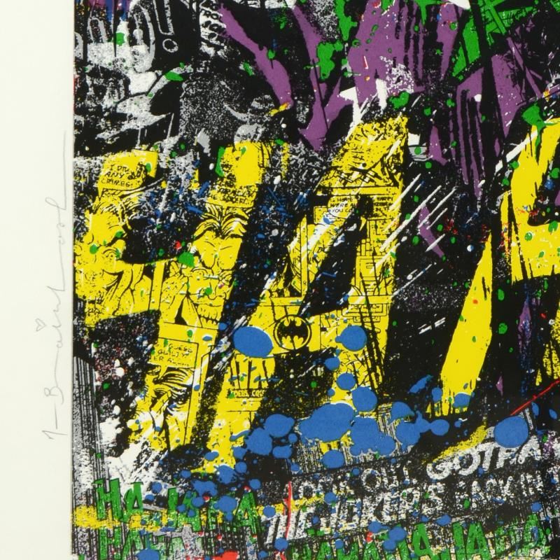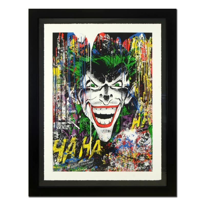 "Joker" is a limited edition silk screen print on paper by Mr Brainwash. The piece is hand signed by the artist and numbered PP 3/5. The piece comes custom framed and with a Letter of Authenticity. There is a minor imperfection in the plexiglass at the bottom, middle, of the piece. Measures approximately 55" x 43" (framed), 41" x 29" (image).