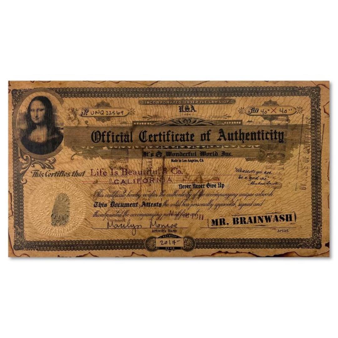 "Marilyn Monroe" is a unique (UNIQ) mixed media on deckle edge paper by Mr. Brainwash, hand signed inverso and bearing the thumbprint of the artist. This piece comes custom framed. Includes Certificate of Authenticity. Measures approx. 44" x 44" (frame), 40" x 40" (image).