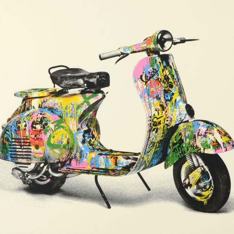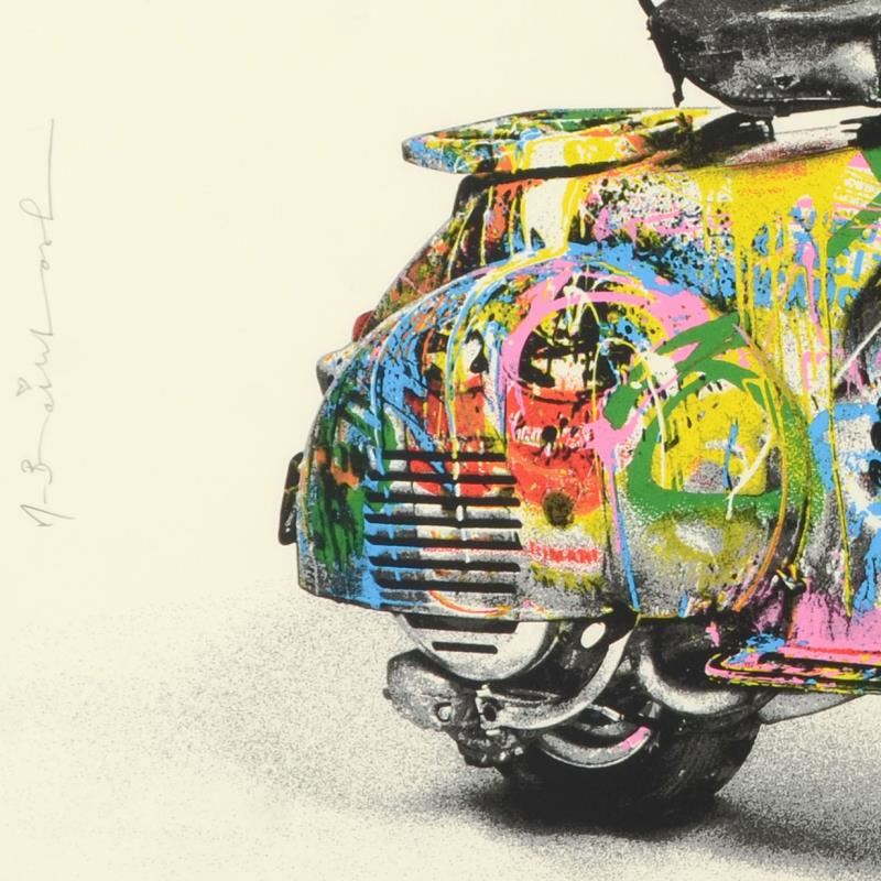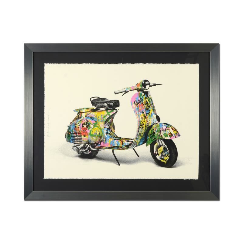 "Vespa (Small)" is a limited edition silk screen print on paper by Mr Brainwash. The piece is hand signed by the artist and numbered PP 2/5. The piece comes custom framed and with a Letter of Authenticity. Measures approximately 38" x 30" (framed), 28" x 20" (image).