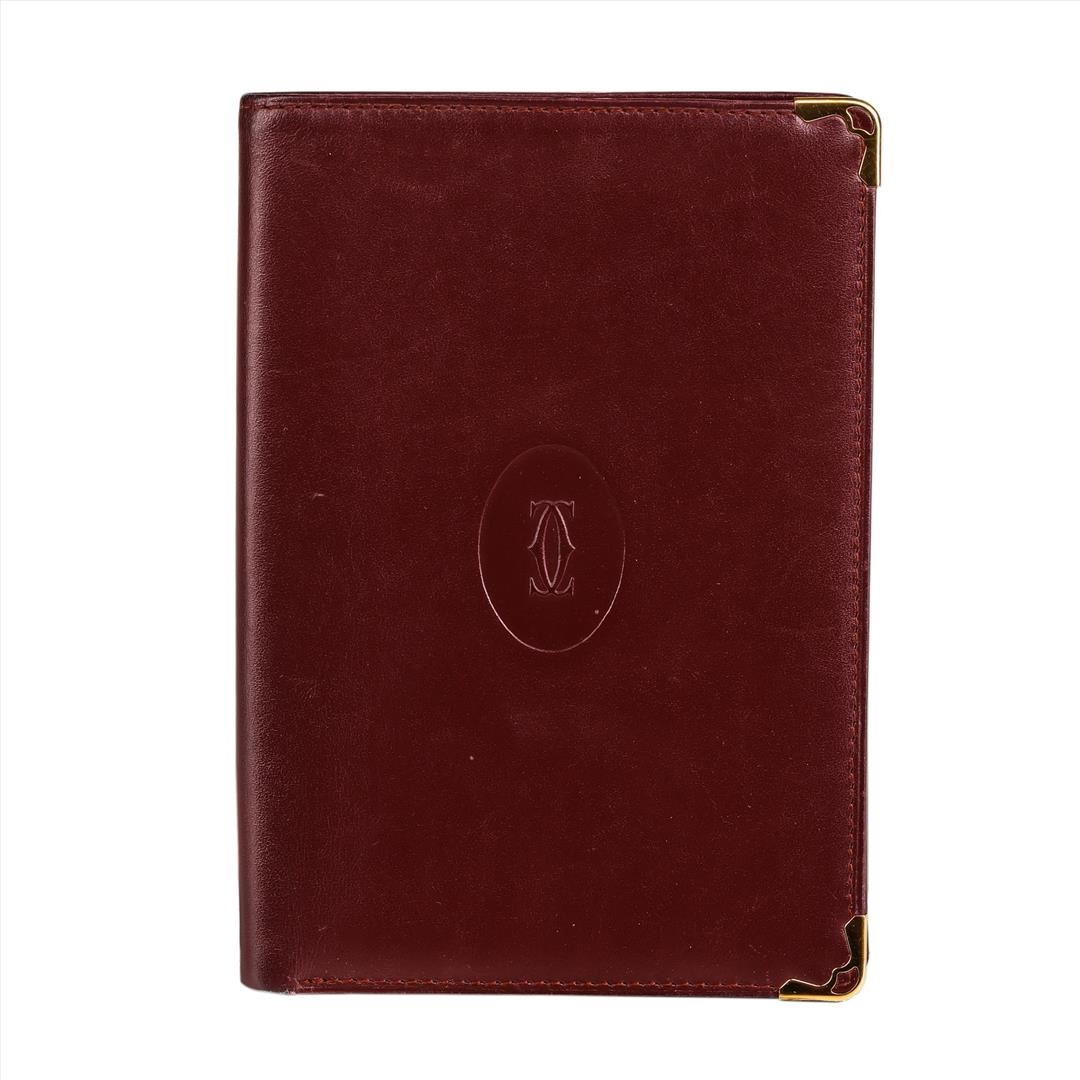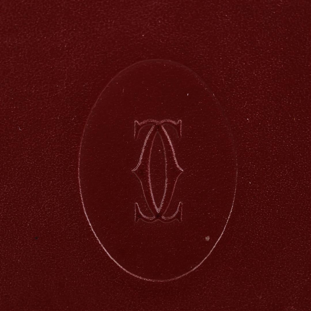 This 100% authentic Must De Cartier Bifold Passport Wallet in signature Bordeaux Red Leather is perfect for truly first class travelers. It features supple burgundy red leather embossed with the Cartier logo on the front, gold tip details and "Cartier Paris " gold leaf stamped inside. Interior features 6 card slots, clear slot for passport and open compartment at top for money and other travel papers. This is in great used condition with minor signs of wear, please see pictures. Complete with original box and dustbag. Made in Italy. Approximate dimensions: 3.5" x 5.1"