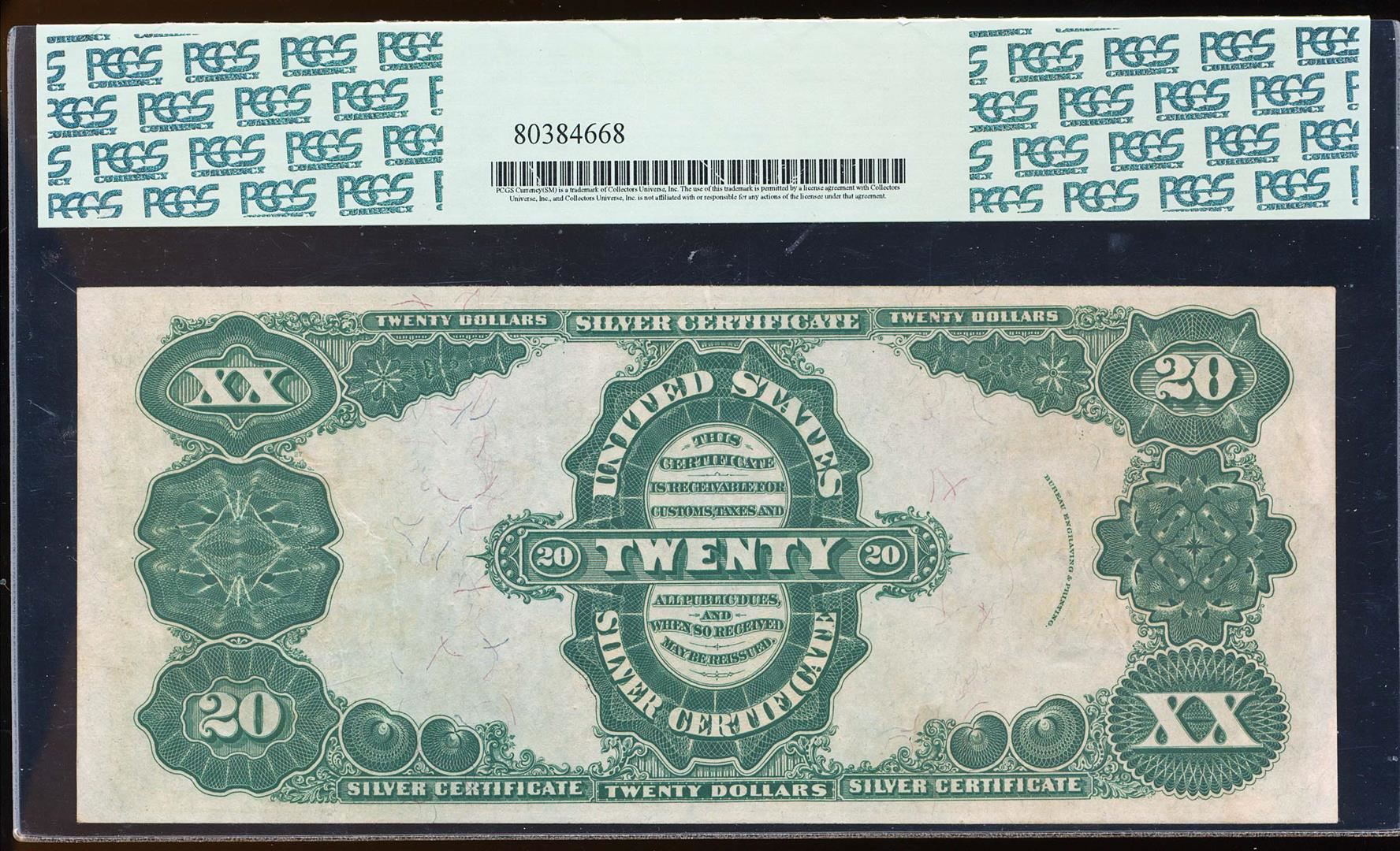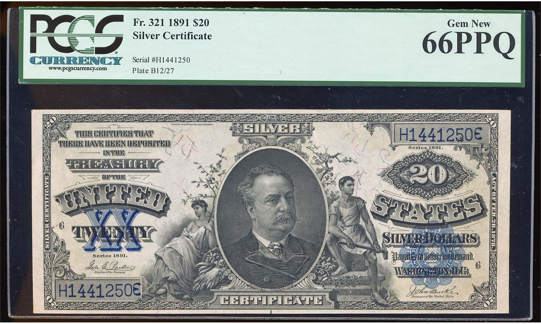 This 1891 $20 Manning Silver Certificate Note Fr.321 PCGS Graded Gem New 66PPQ with None Finer Known. This series of wonderfully designed $20 Silver Certificates features the portrait of Daniel Manning as on the previous note. This 1891-dated example displays large even margins and sharply printed design elements. Neither PCGS nor PMG has graded an example above the 66 grade level. With an estimated printing quantity of 1,520,000 and a survival of fewer than 400 notes, most of which are well circulated this elusive and highly sought after note is certainly one to own. PCGS Graded.
