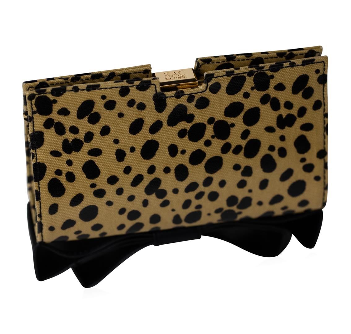 Authentic new with tag Zac Posen Leopard Print Clutch with black bow detail. This pretty little hand-held clutch is the perfect way to add some spice to an evening look. Zac Posen does not disappoint with this fun bag! Complete with gold details and original tag.