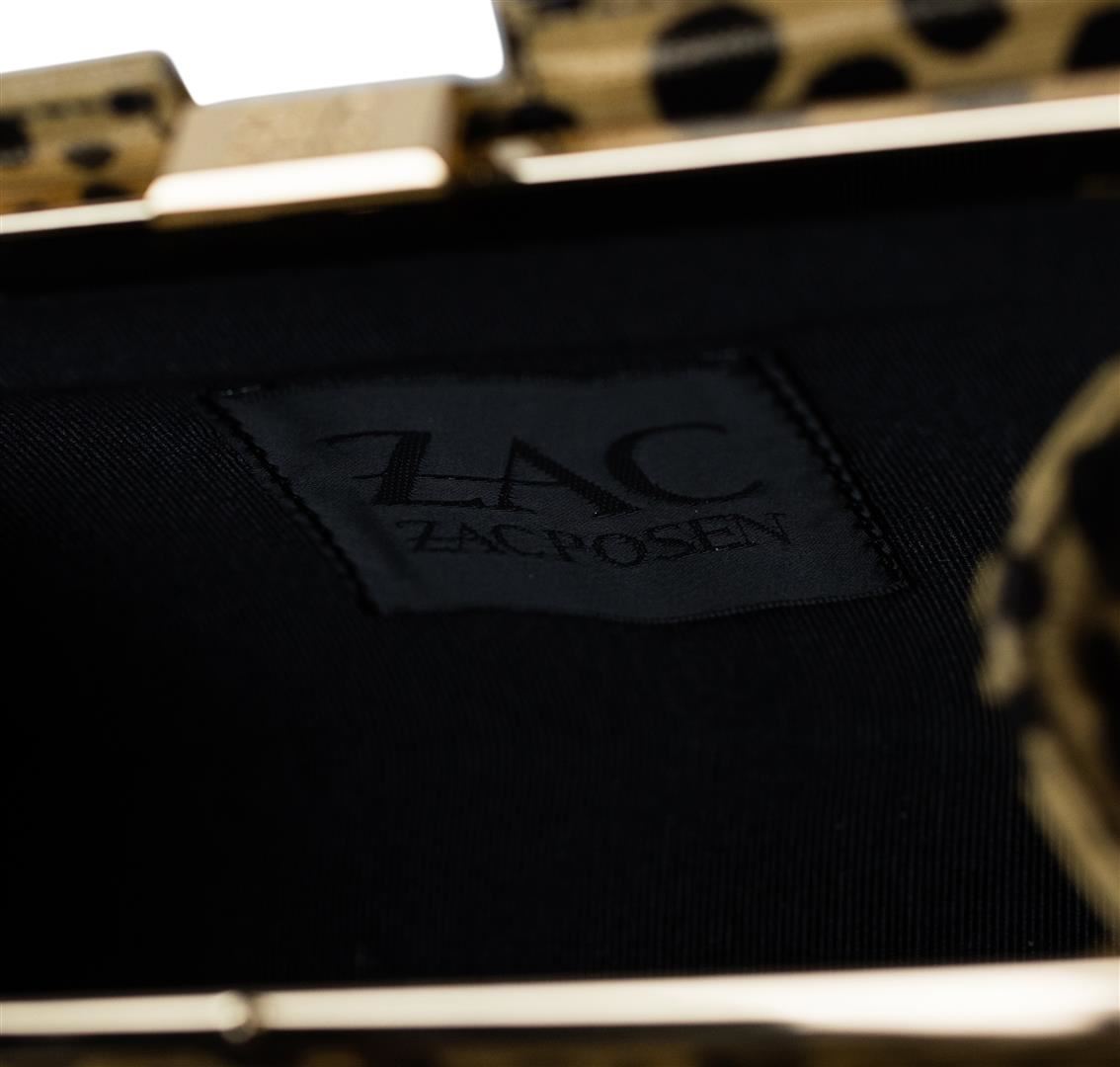 Authentic new with tag Zac Posen Leopard Print Clutch with black bow detail. This pretty little hand-held clutch is the perfect way to add some spice to an evening look. Zac Posen does not disappoint with this fun bag! Complete with gold details and original tag.