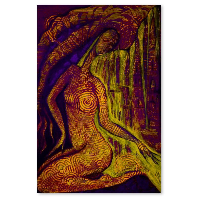 "Land of the Lost Sound" is an original acrylic painting on stretched canvas by Nadia Volna, hand signed by the artist. This piece is painted with light-reactive black light paint that reveals brilliant colors when viewed under incandescent light. This piece comes with a blacklight flashlight (batteries not included). Includes Letter of Authenticity. Measures approx. 24" x 36" (image).