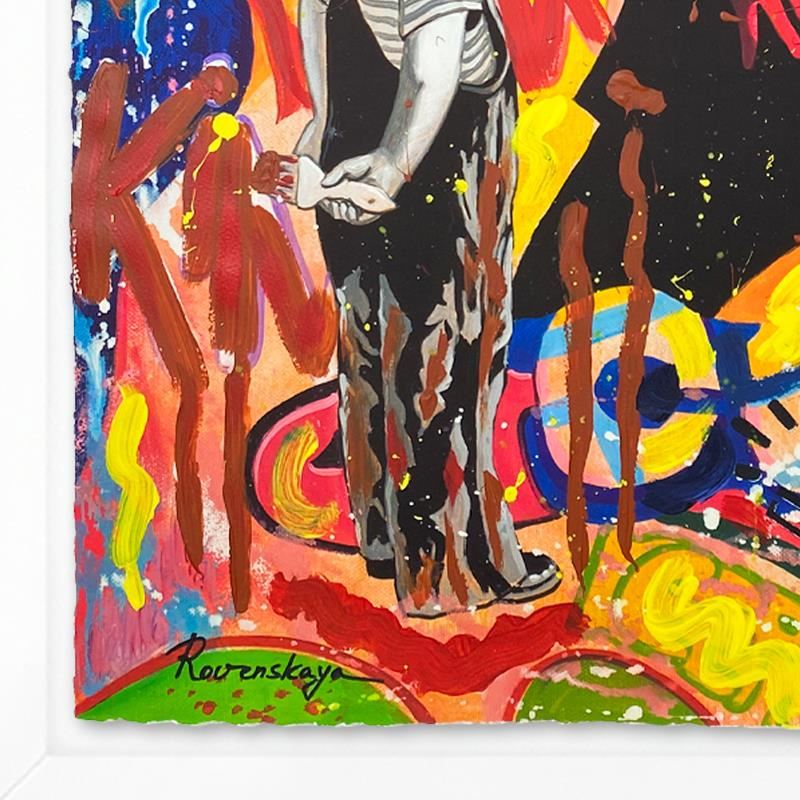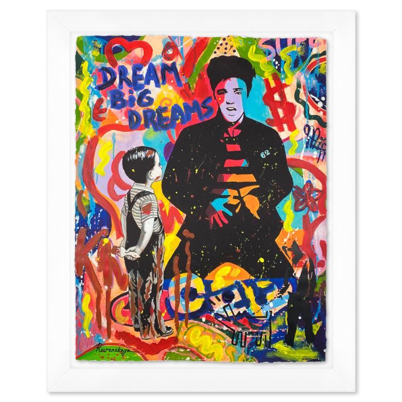 "Dreaming" is a one-of-a-kind mixed media on deckle edge paper by Nastya Rovenskaya, Hand signed by the artist. This piece comes floating in a custom frame. Includes Letter of Authenticity. Measures approximately 34" x 28" (framed), 30" x 24" (image).