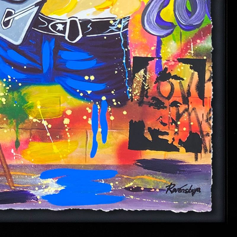 "Elvis Presley" is a one-of-a-kind mixed media on deckle edge paper by Nastya Rovenskaya, Hand signed by the artist. This piece comes floating in a custom frame. Includes Letter of Authenticity. Measures approximately 34" x 27" (framed), 30" x 23" (image)