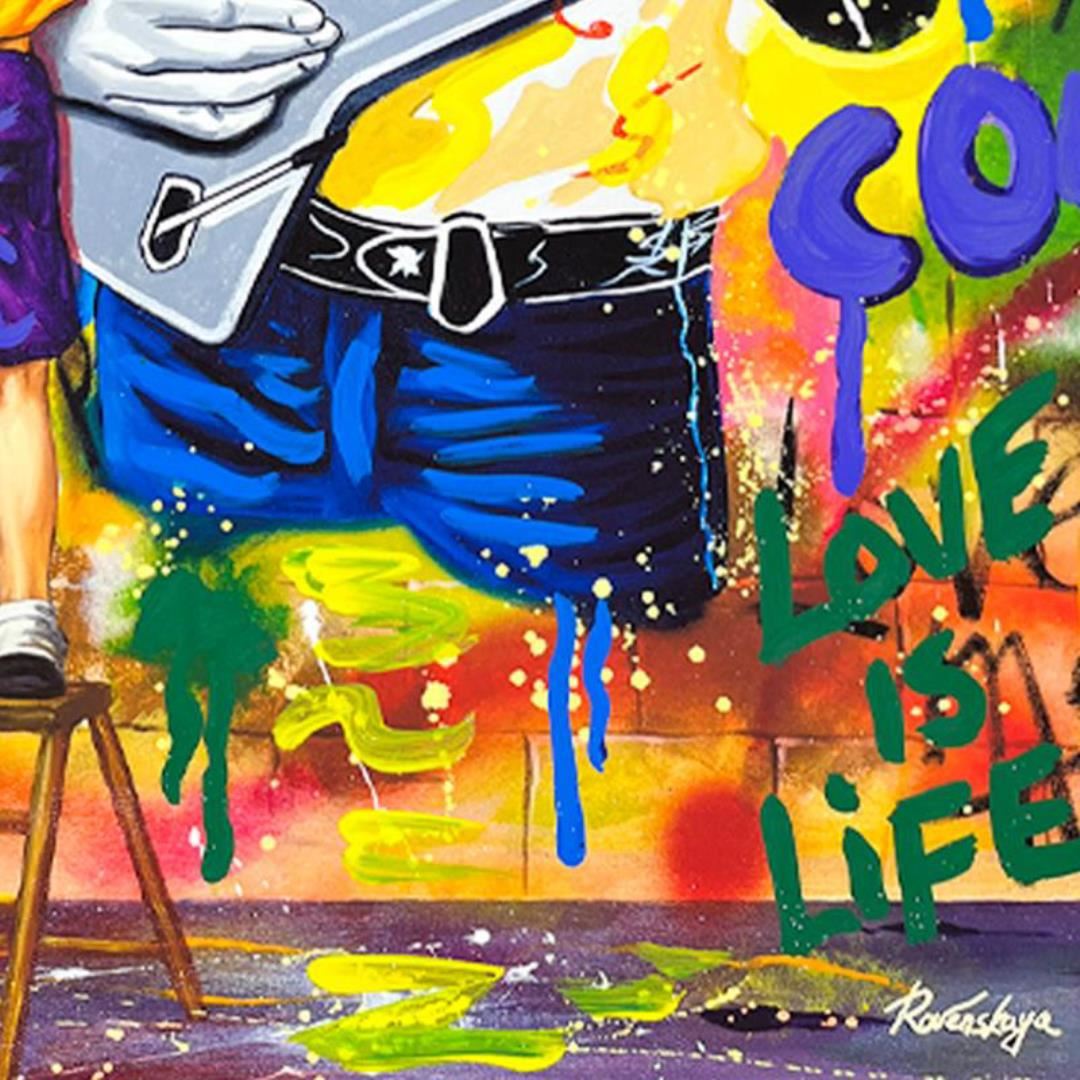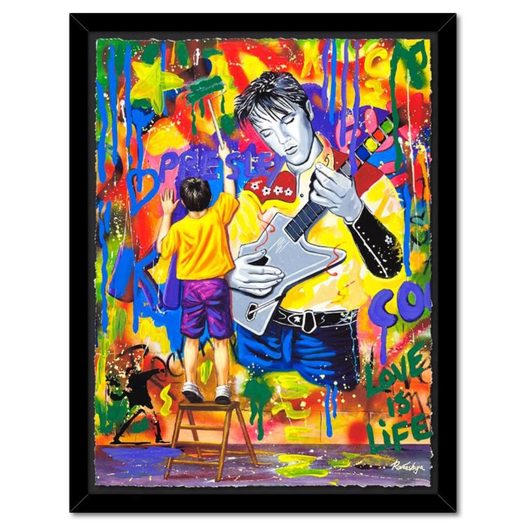"Elvis Presley" is a one-of-a-kind mixed media on deckle edge paper by Nastya Rovenskaya; hand signed by the artist. This piece comes custom framed and includes letter of authenticity. Measures approximately 36.5" x 30" (framed), 30.5" x 24" (image).