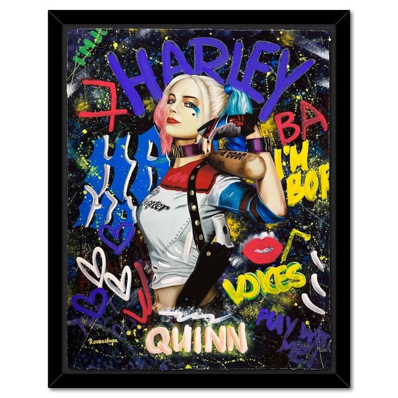 "Harley Quinn is Here" is a one-of-a-kind mixed media on deckle edge paper by Nastya Rovenskaya; hand signed by the artist. This piece comes custom framed and includes letter of authenticity. Measures approximately 46" x 36.5" (framed), 40" x 30.5" (image).