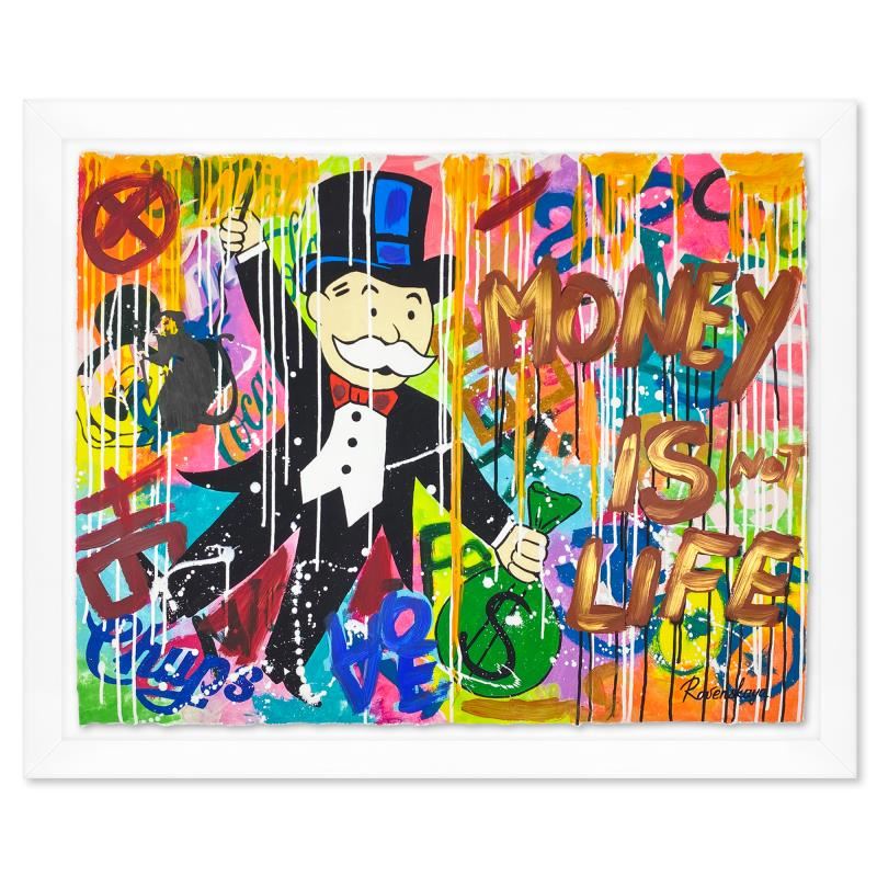 "Monopoly Money" is a one-of-a-kind mixed media on deckle edge paper by Nastya Rovenskaya, Hand signed by the artist. This piece comes floating in a custom frame. Includes Letter of Authenticity. Measures approximately 28" x 34" (framed), 24" x 30" (image).