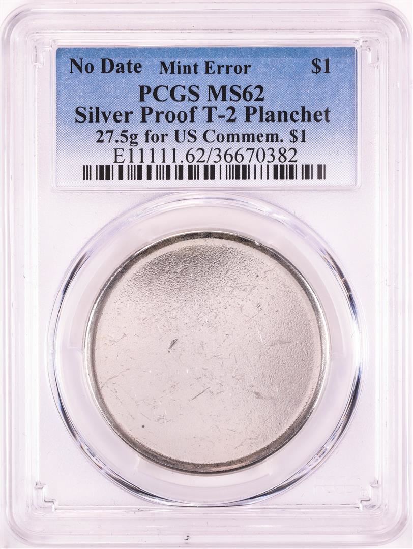 No Date Proof $1 Mint Error T-2 Silver Planchet PCGS MS62