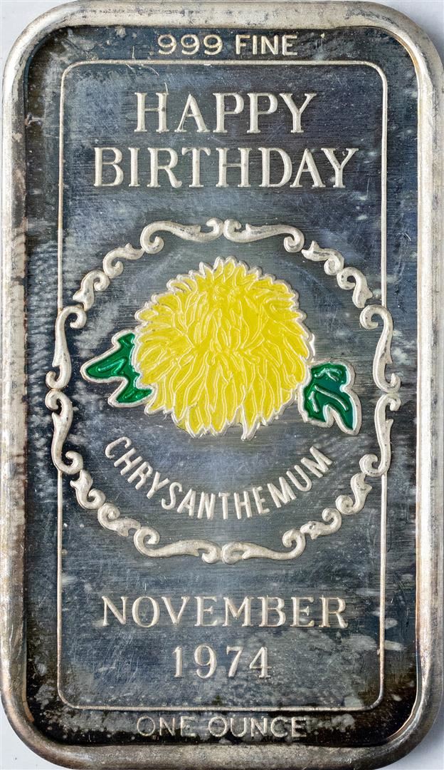 One November 1974 Happy Birthday Enamel Silver Art Bar.