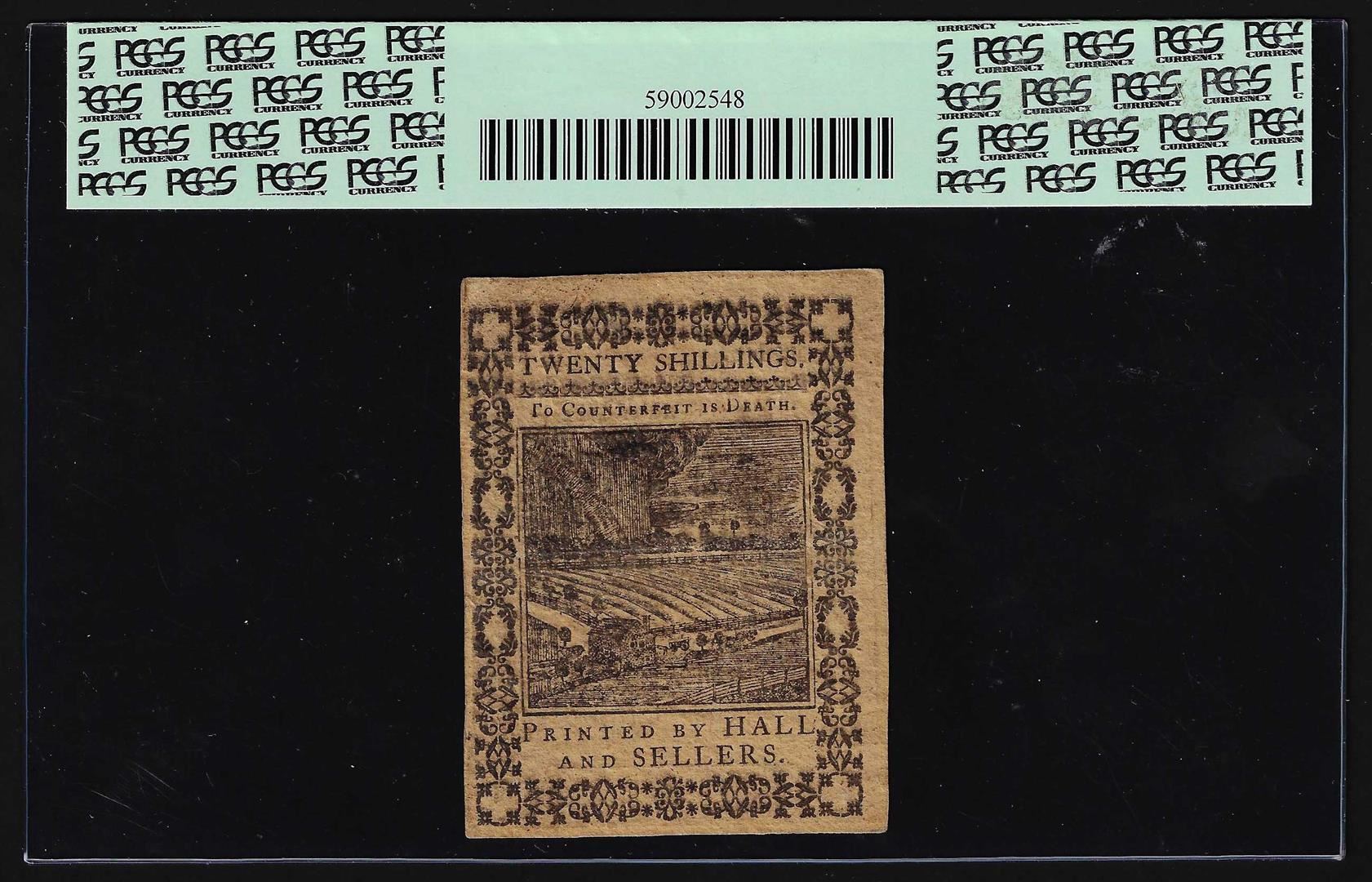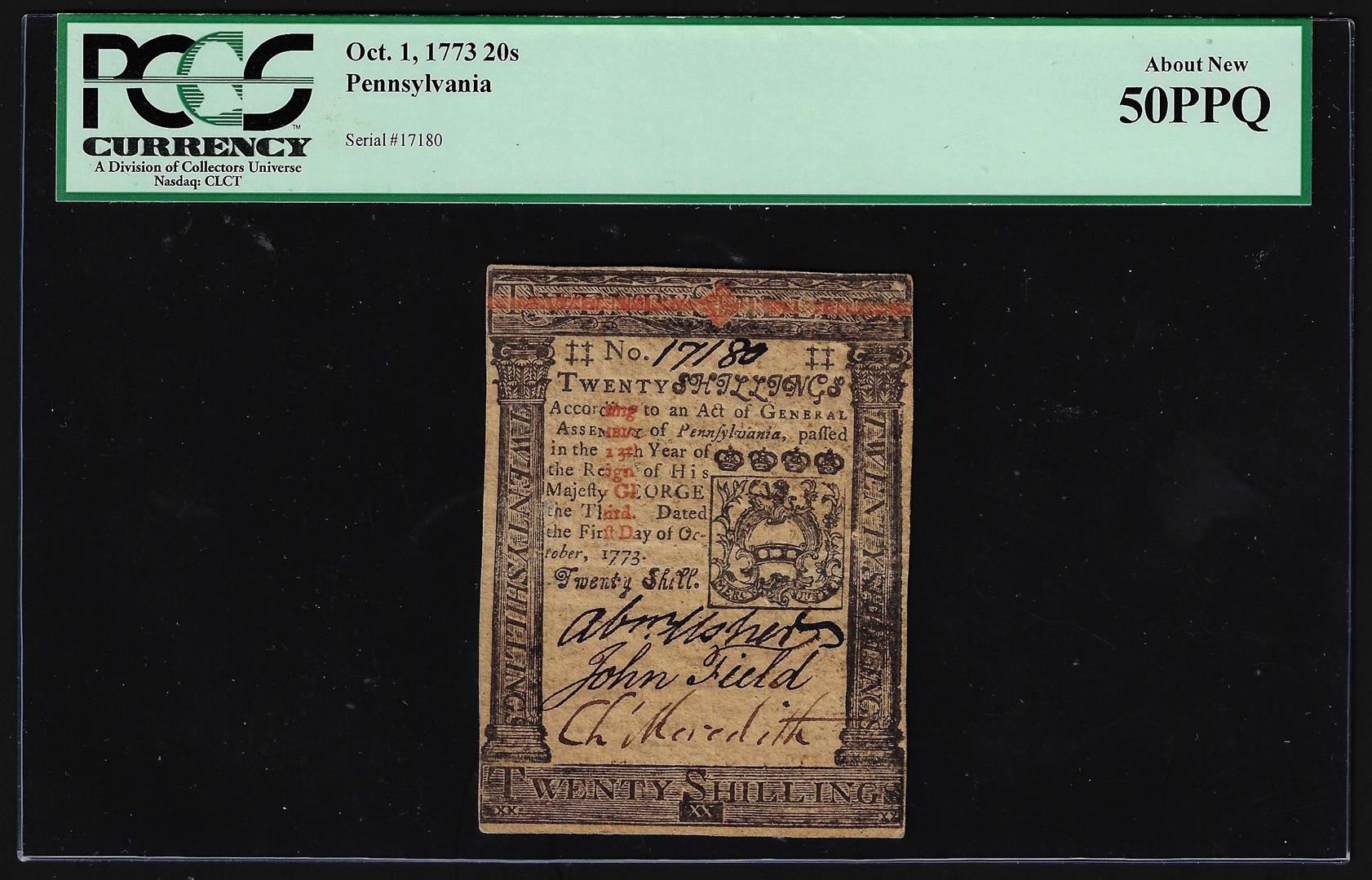 One October 1, 1773 Pennsylvania 20 Shillings Currency Note PCGS About New 50PPQ. PCGS Graded.