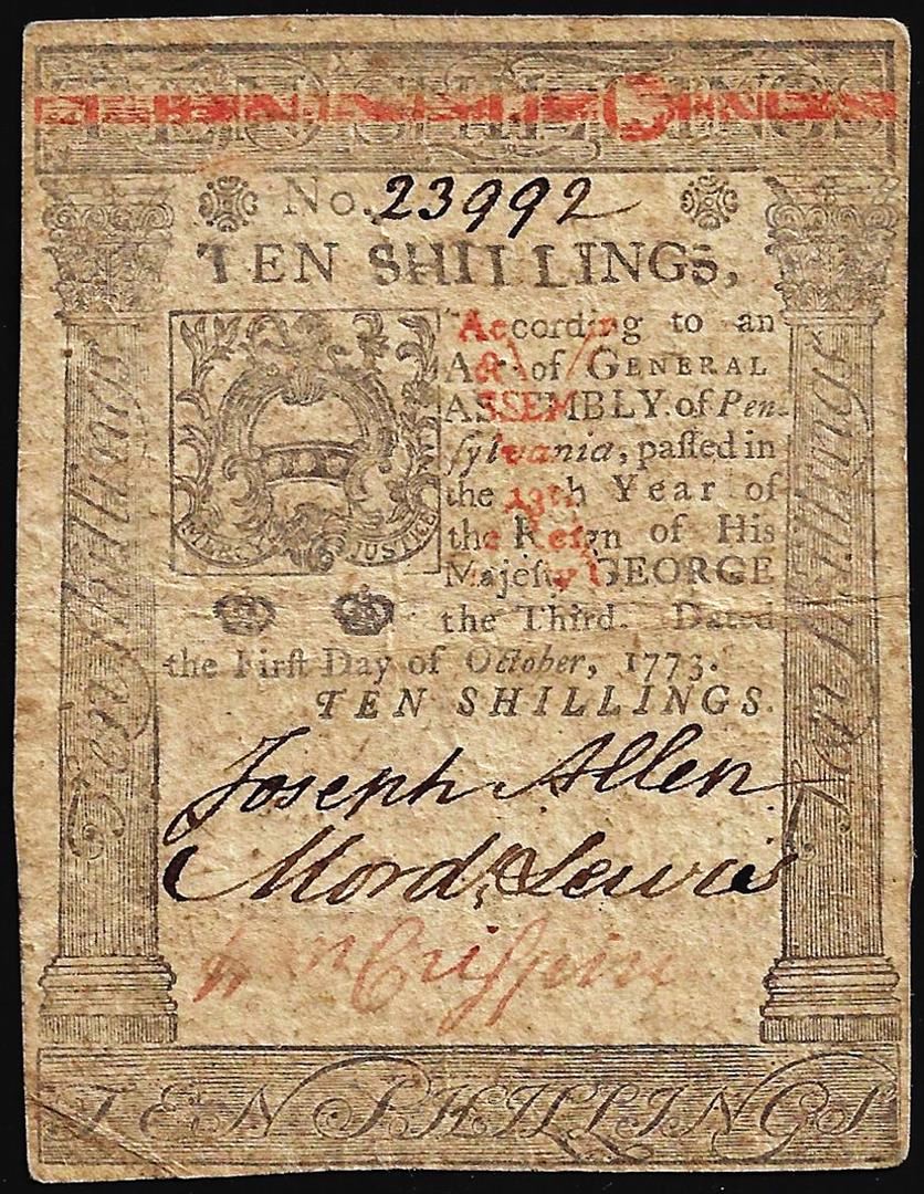 One October 1, 1773 Pennsylvania Ten Shillings Colonial Currency Note.
