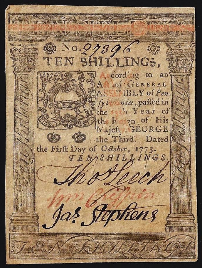 October 1, 1773 Ten Shillings Pennsylvania Colonial Currency Note