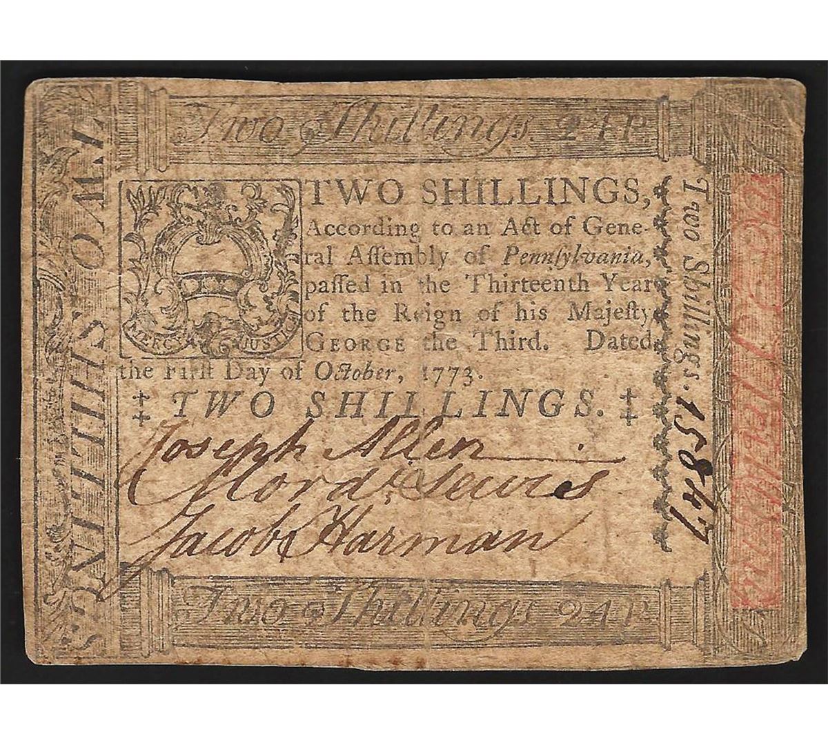 October 5, 1773 Two Shillings Pennsylvania Colonial Currency Note