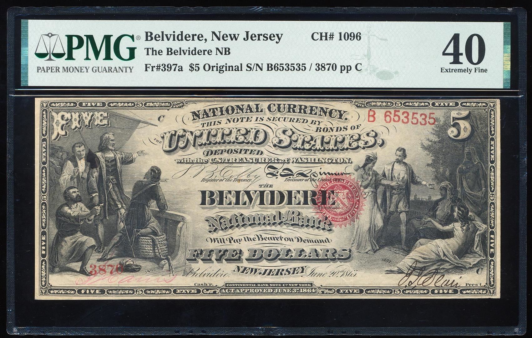 Original 1865 $5 Belvidere, NJ CH# 1096 National Currency Note PMG Extremely Fine 40