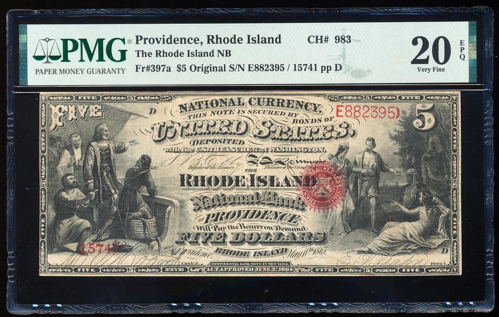 Original 1865 $5 Rhode Island Providence, RI CH# 983 National Note PMG VF 20EPQ