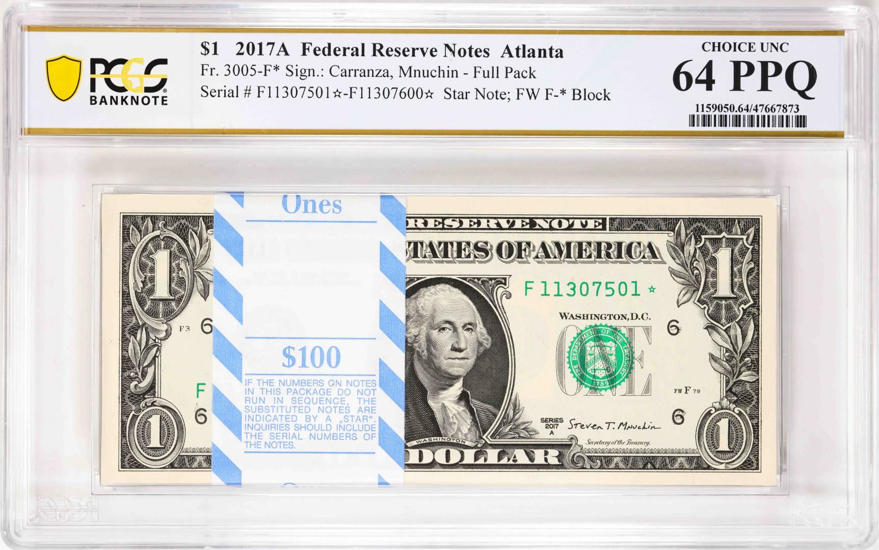 One Pack 2017A $1 Federal Reserve STAR Notes Atlanta Fr.3005-F* PCGS Choice Unc 64PPQ. PCGS Graded.