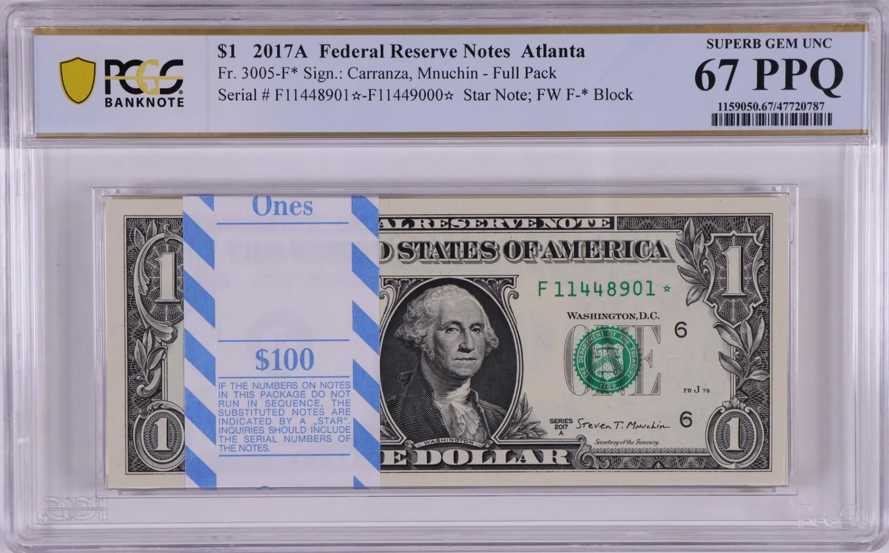One Pack 2017A $1 Federal Reserve STAR Notes Atlanta Fr.3005-F* PCGS Superb Gem UNC 67PPQ. PCGS Graded.