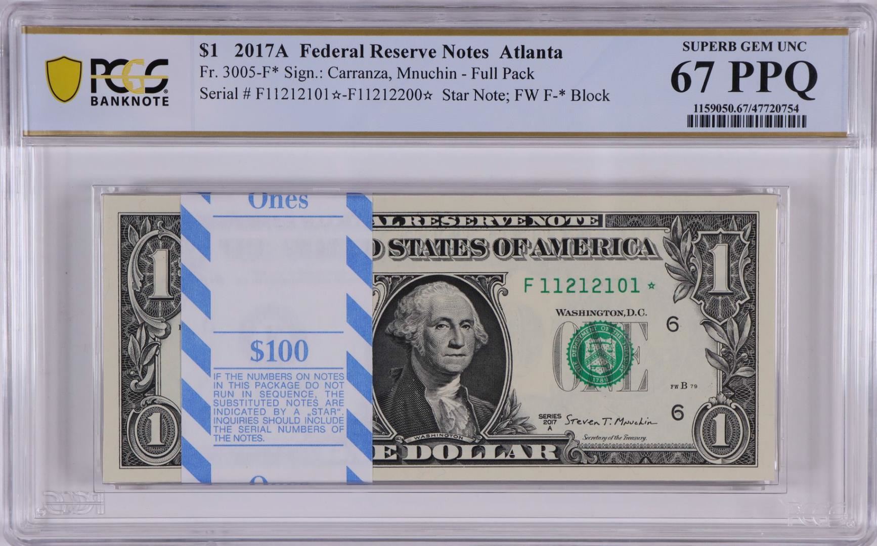 One Pack 2017A $1 Federal Reserve STAR Notes Atlanta Fr.3005-F* PCGS Superb Gem UNC 67PPQ. PCGS Graded.