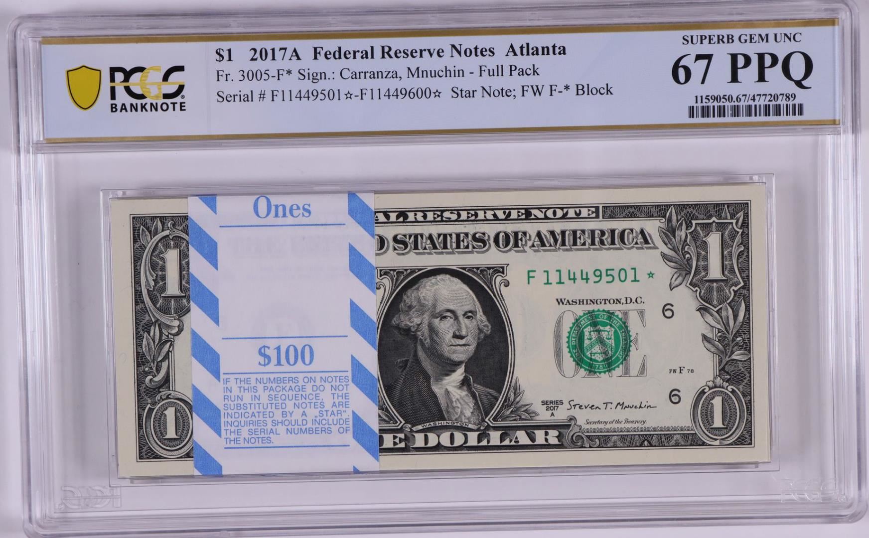 One Pack 2017A $1 Federal Reserve STAR Notes Atlanta Fr.3005-F* PCGS Superb Gem UNC 67PPQ. PCGS Graded.