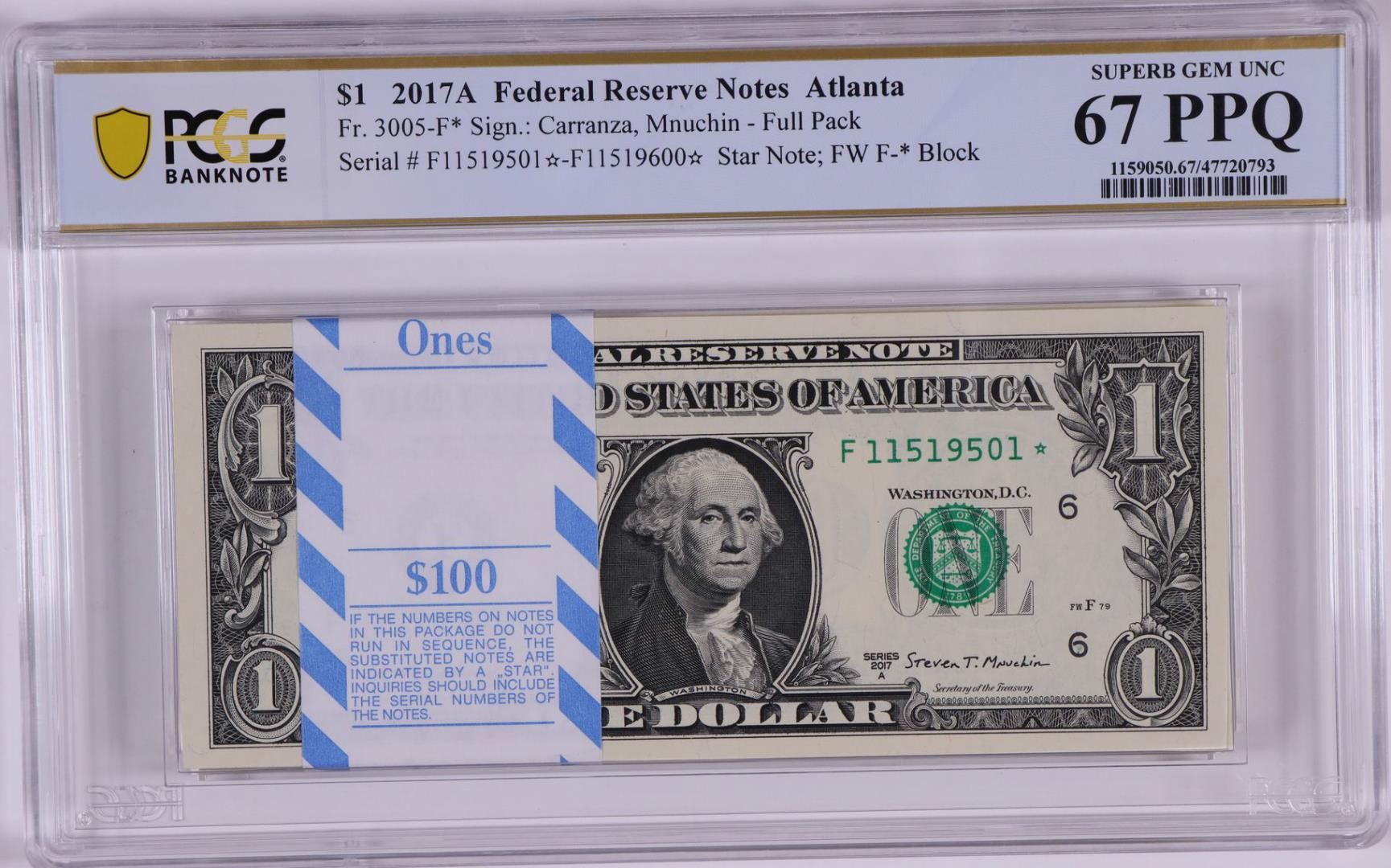One Pack 2017A $1 Federal Reserve STAR Notes Atlanta Fr.3005-F* PCGS Superb Gem UNC 67PPQ. PCGS Graded.