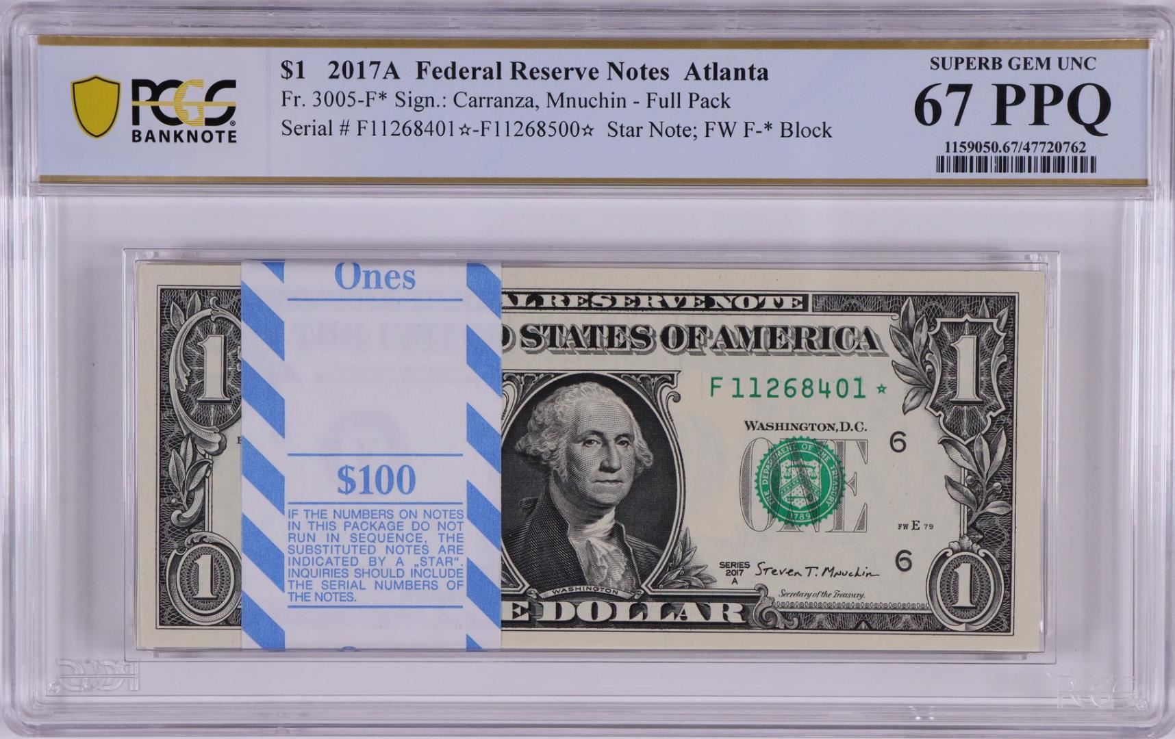 One Pack 2017A $1 Federal Reserve STAR Notes Atlanta Fr.3005-F* PCGS Superb Gem UNC 67PPQ. PCGS Graded.