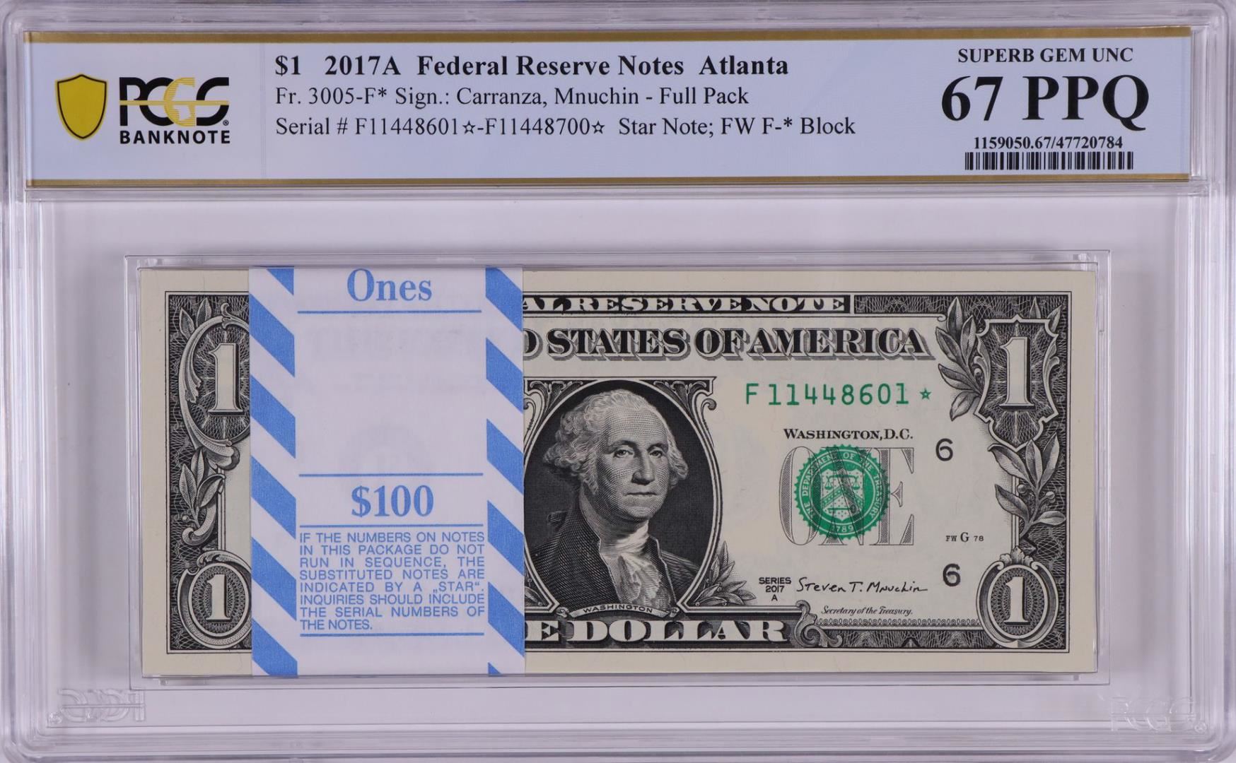 One Pack 2017A $1 Federal Reserve STAR Notes Atlanta Fr.3005-F* PCGS Superb Gem UNC 67PPQ. PCGS Graded.